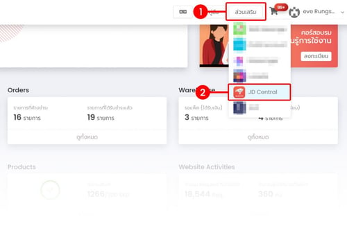 5. เมื่อได้รับอีเมลแจ้งผลการเชื่อมต่อสินค้า ให้ทำการรีเฟรชเว็บไซต์ จากนั้นกดเข้ามาเช็คสืนค้าที่ถูกดึงมา โดยคลิกที่ปุ่ม "ส่วนเสริม" (ตำแหน่งที่ 5) และเลือกเมนู "JD Central" (ตำแหน่งที่ 6)