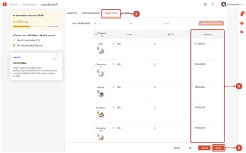 (ตำแหน่งที่ 4) ในส่วนรายการตัวเลือกสินค้า ระบุเลข SKU ให้ครบทุกตัวเลือกสินค้า **โดยเลข SKU จะต้องไม่ซ้ำกัน