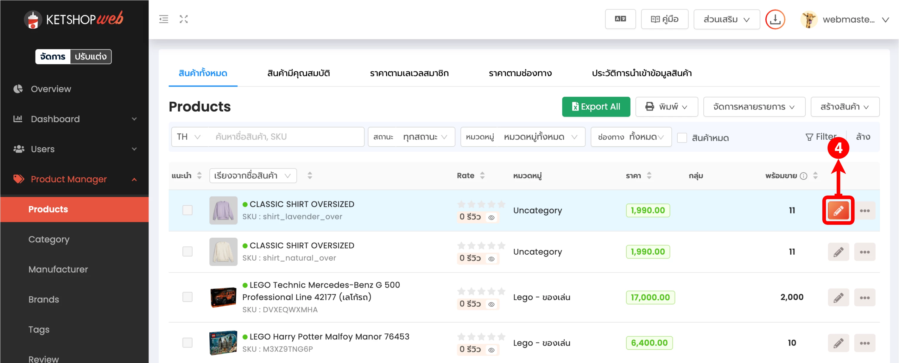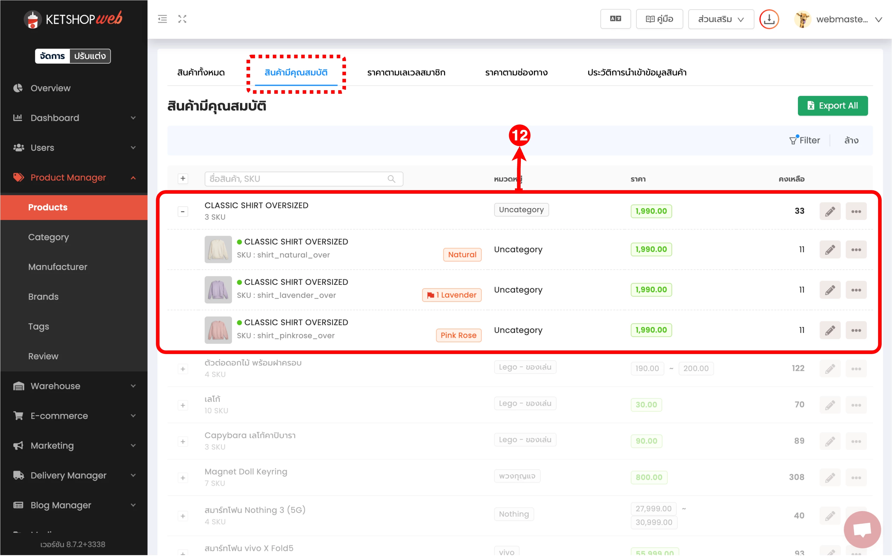 (ตำแหน่งที่ 12) ในหน้า Products → สินค้ามีคุณสมบัติ จะเห็นว่าสินค้าจับเป็นกลุ่มเดียวกัน