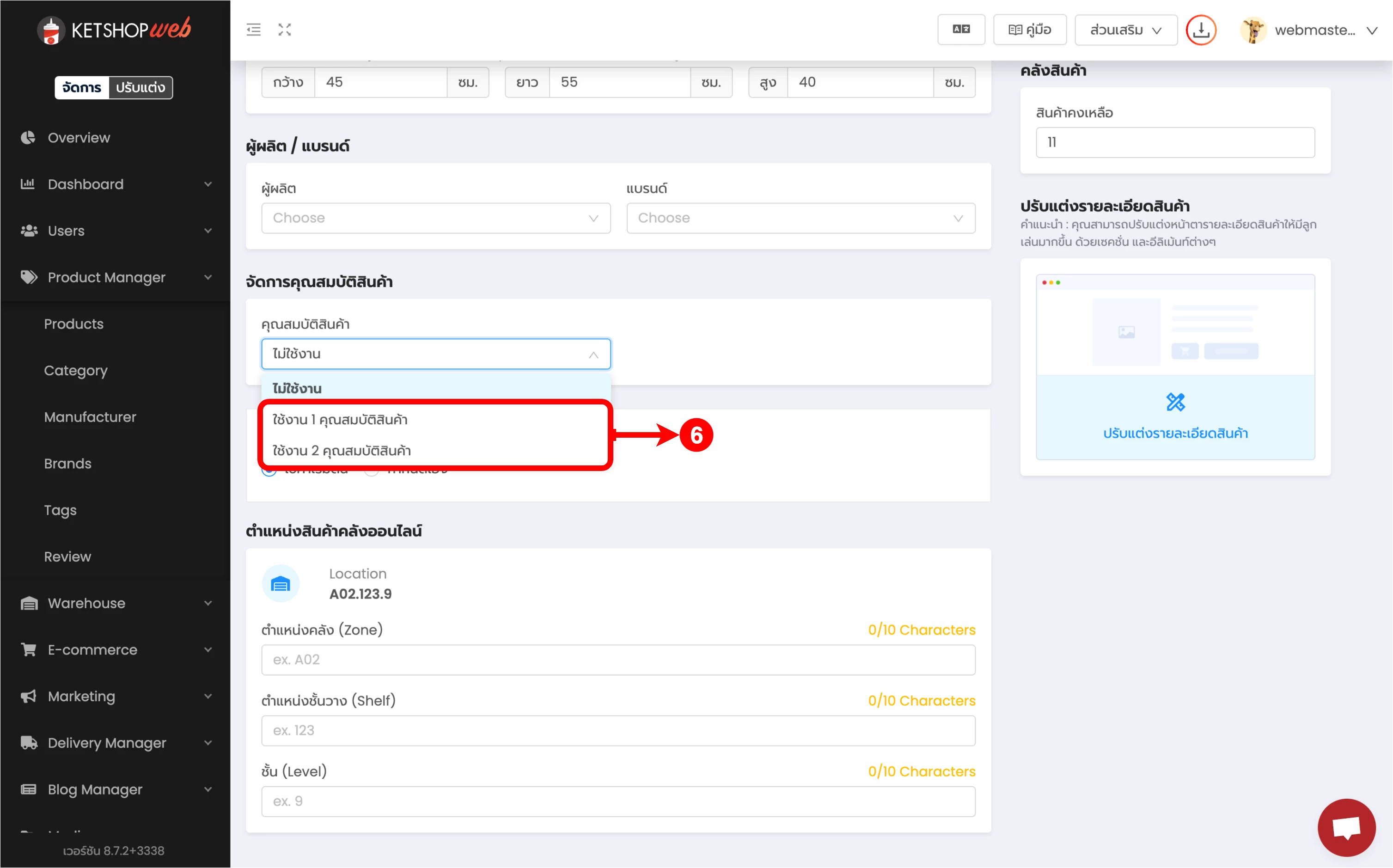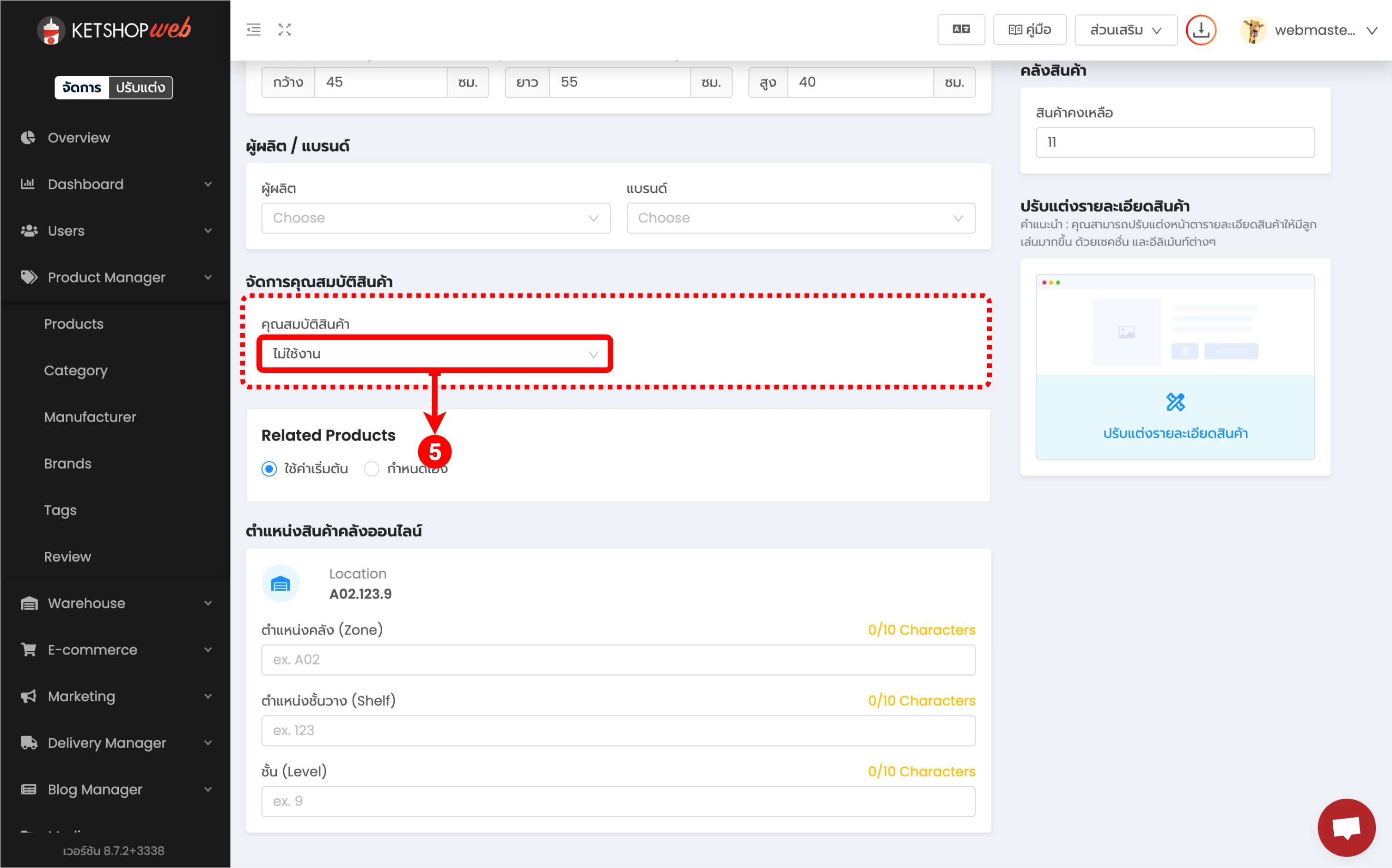 (ตำแหน่งที่ 5) คลิกที่ช่อง 'คุณสมบัติสินค้า' เพื่อเลือกจำนวนคุณสมบัติที่ต้องการใช้งาน