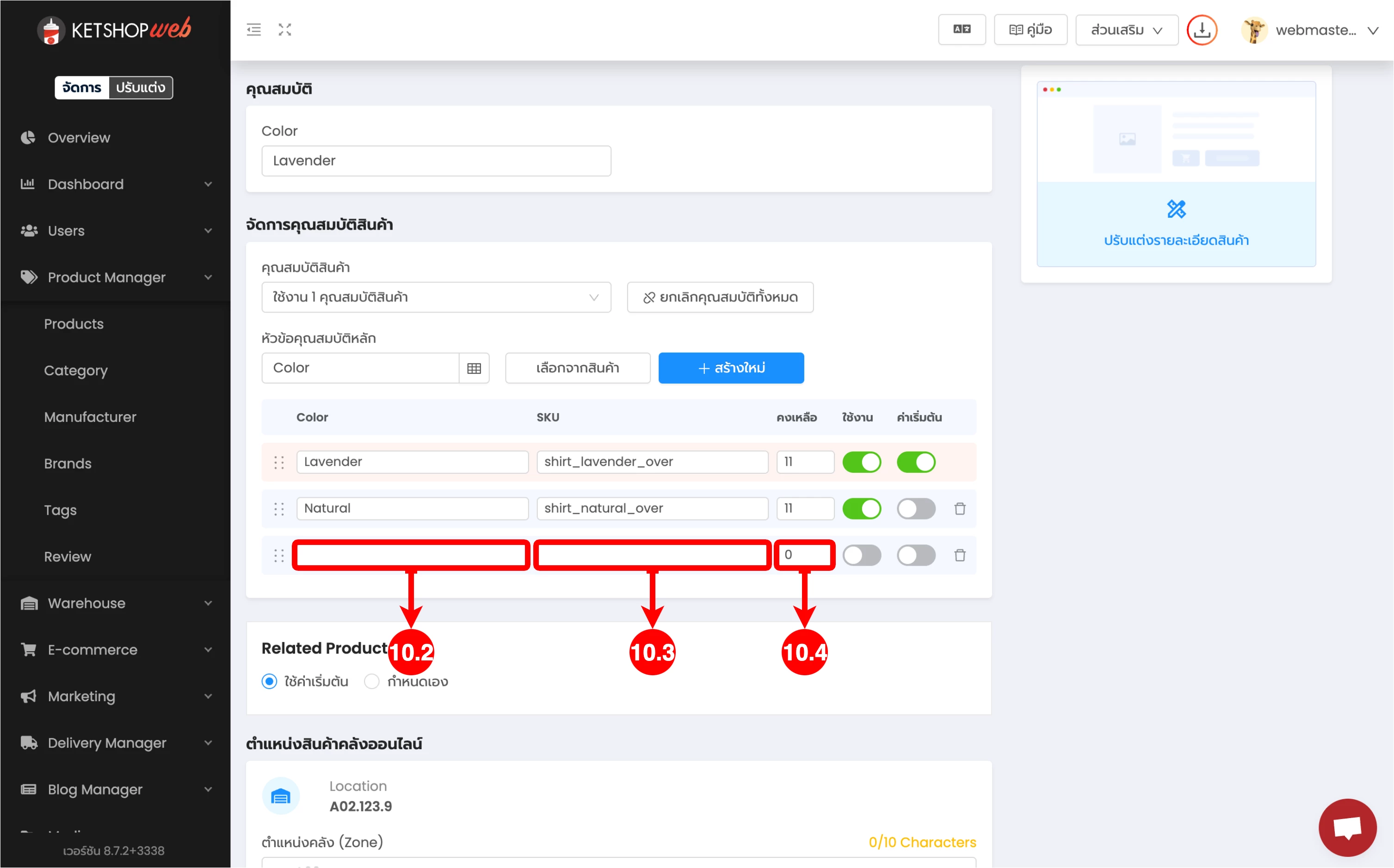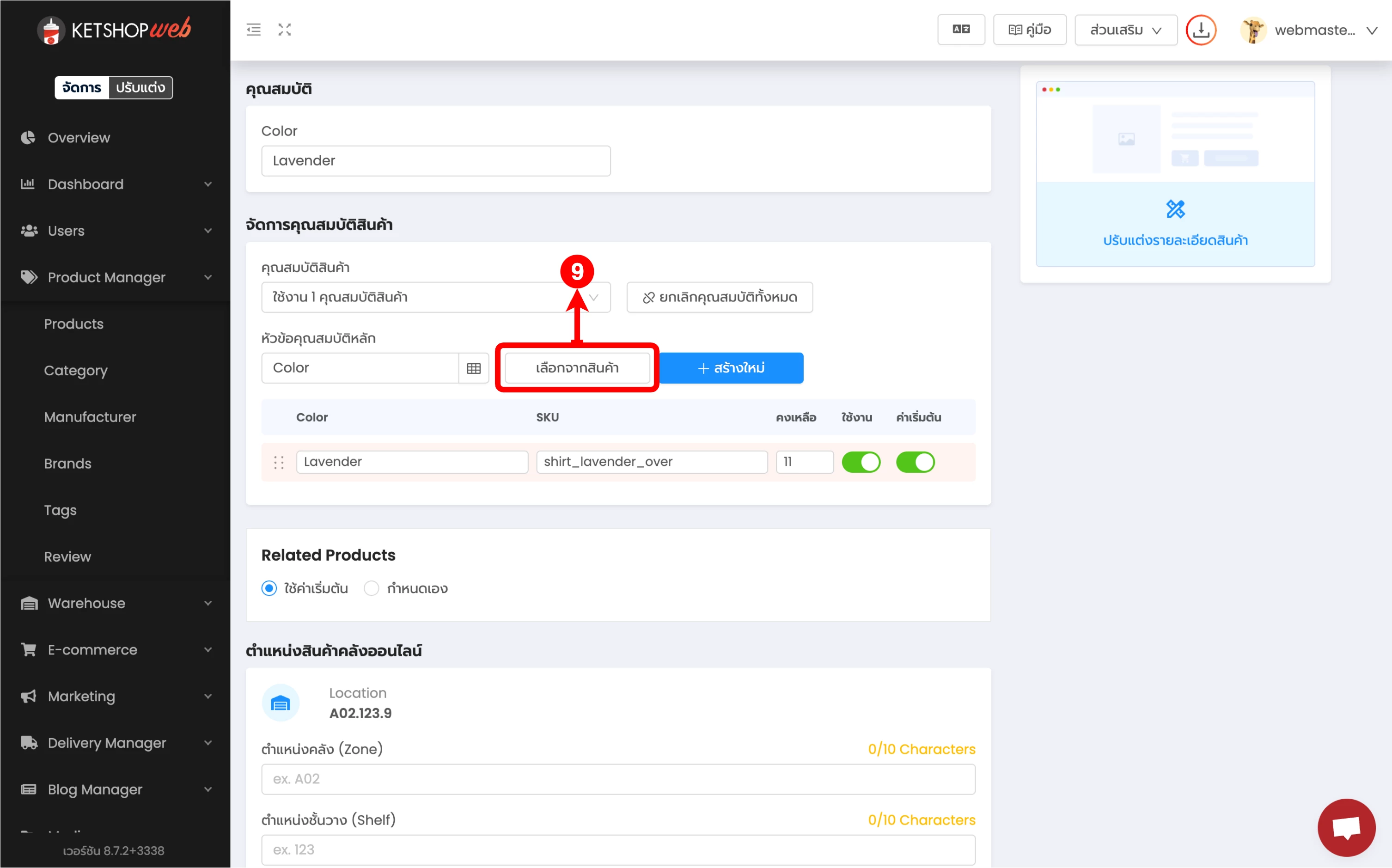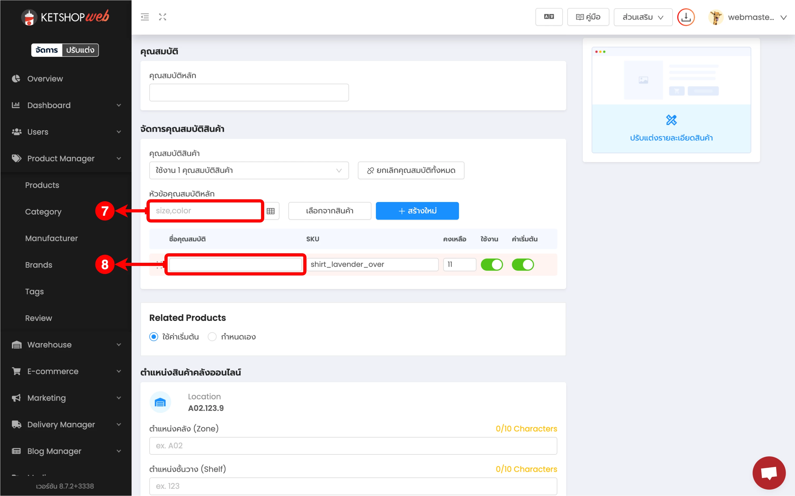 (ตำแหน่งที่ 8) จากนั้น กรอกคุณสมบัติของสินค้านั้น ๆ เช่น สีแดง, ไซส์ L เป็นต้น