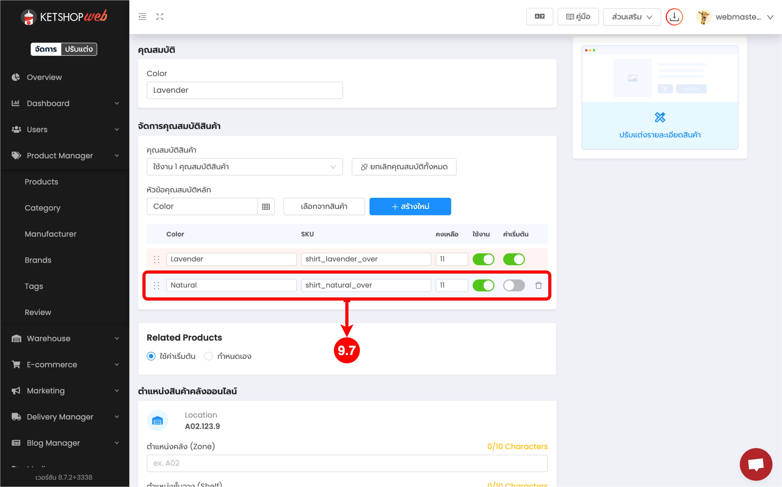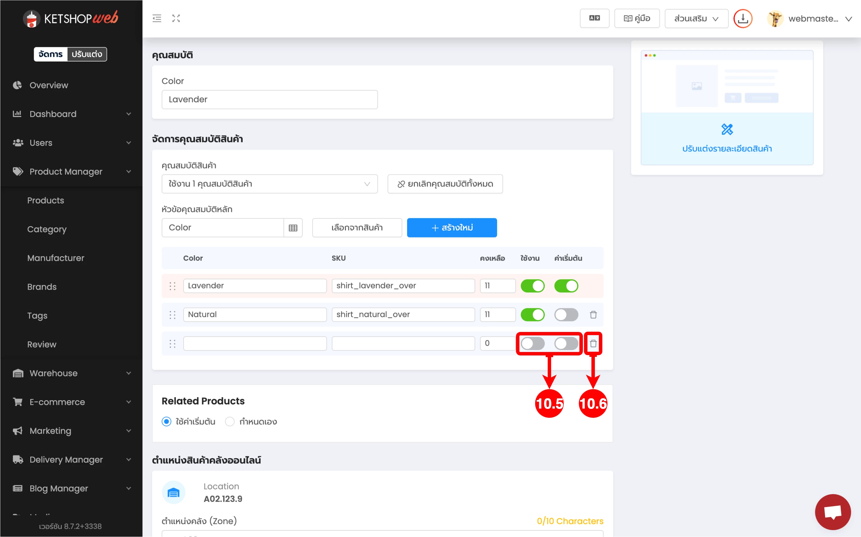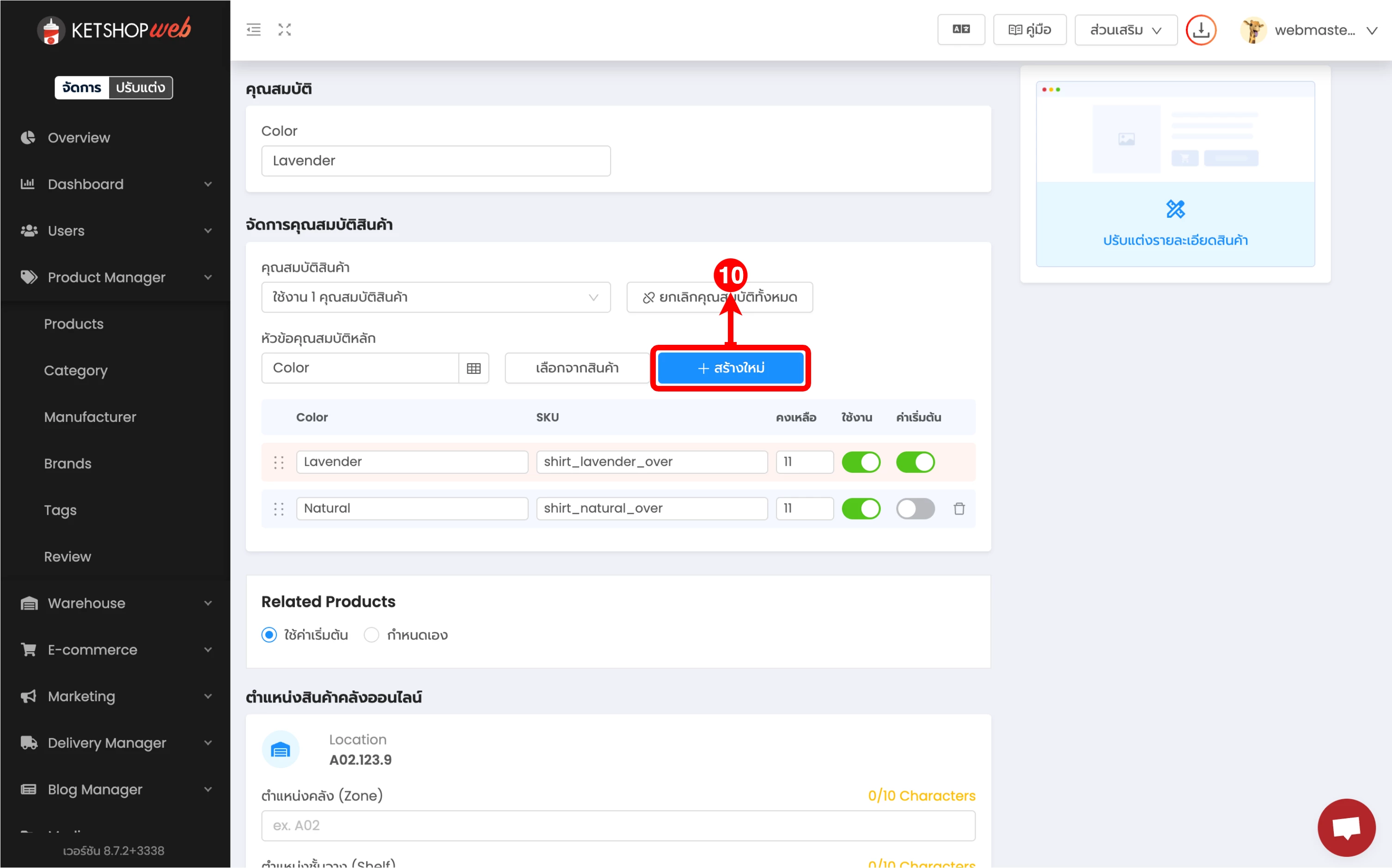 (ตำแหน่งที่ 8) จากนั้น กรอกคุณสมบัติของสินค้านั้น ๆ เช่น สีแดง, ไซส์ L เป็นต้น