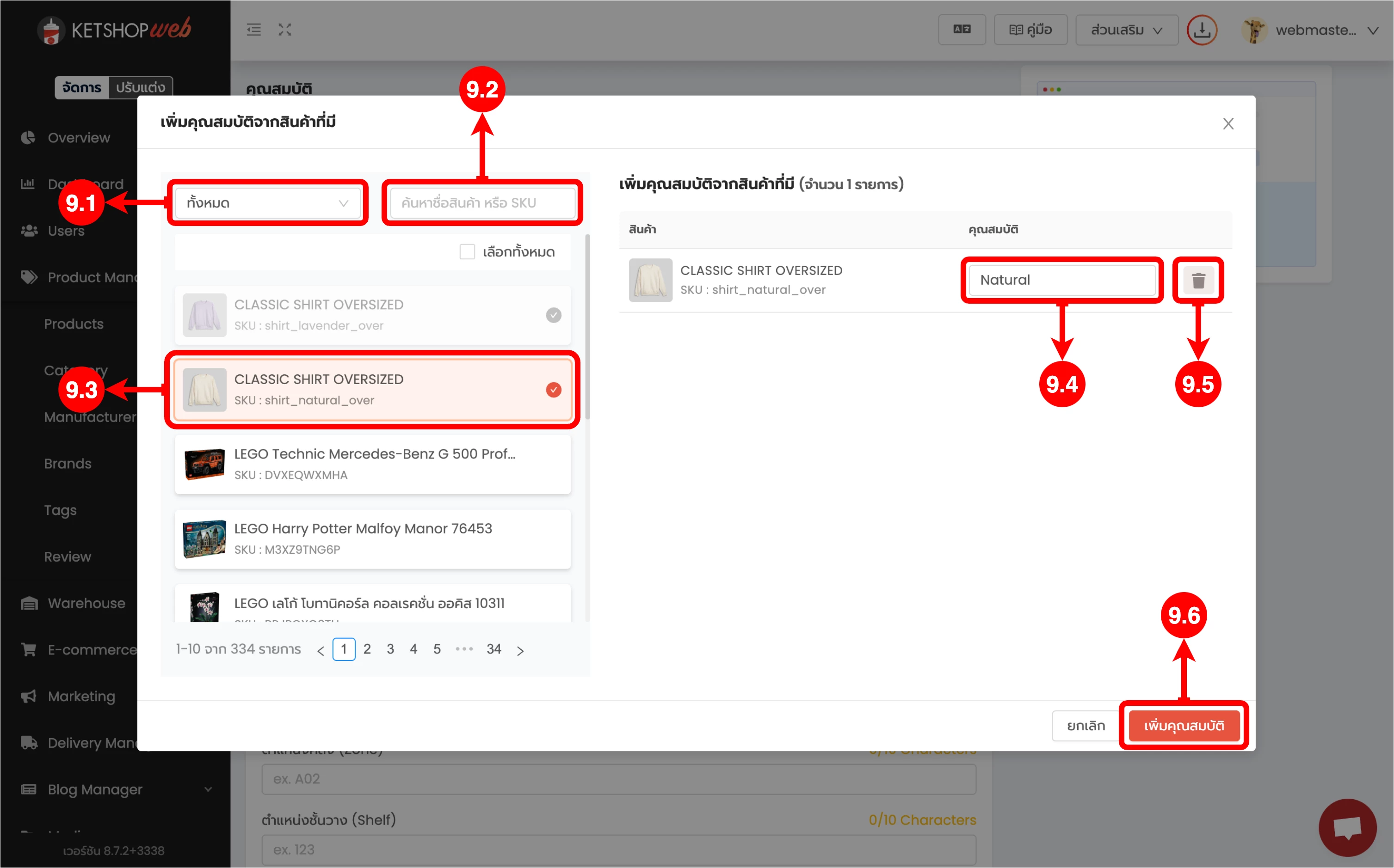 (ตำแหน่งที่ 9.4) กรอกคุณสมบัติของสินค้านั้น ๆ เช่น สีแดง, ไซส์ L เป็นต้น