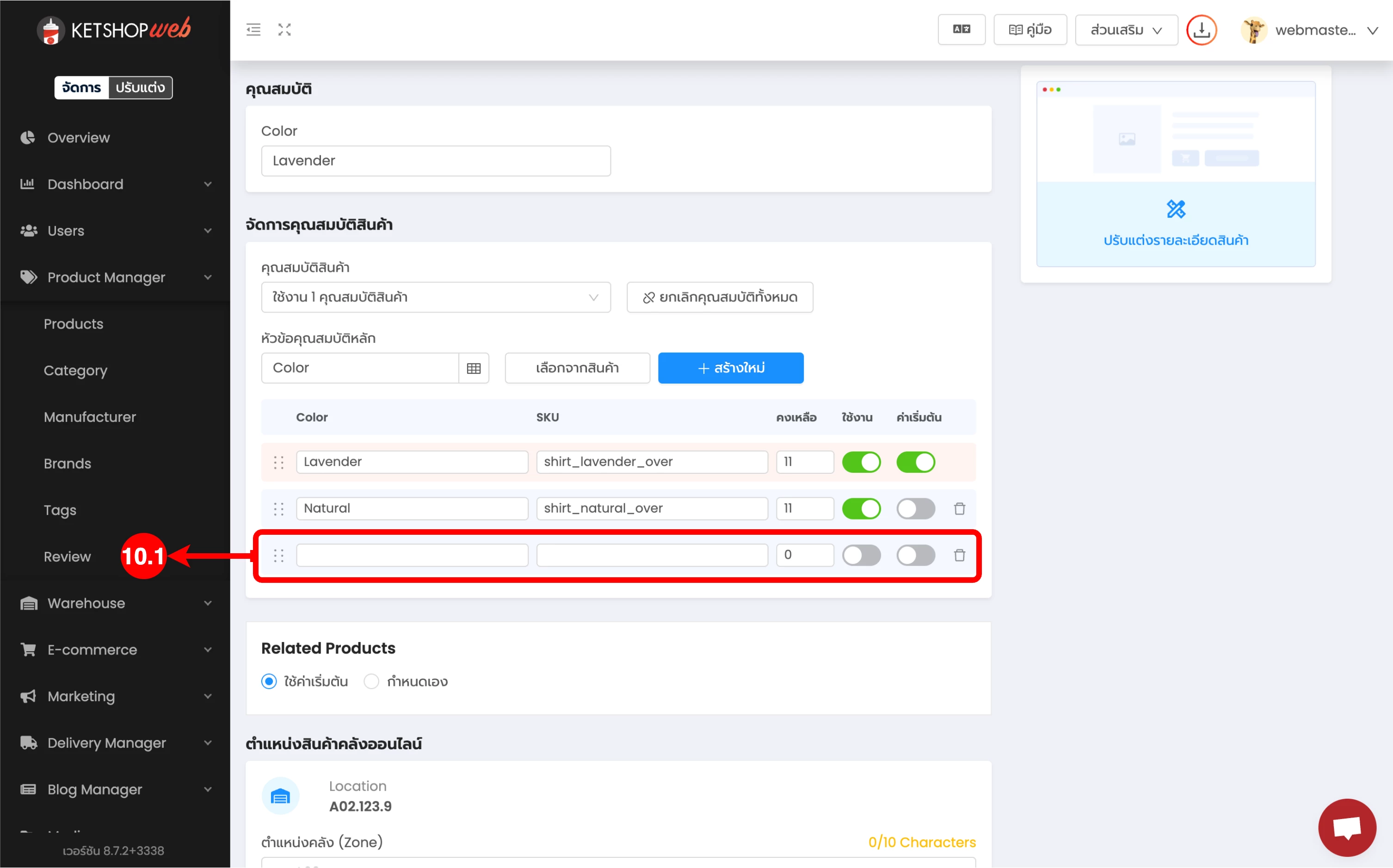 (ตำแหน่ง 10.2) กรอกคุณสมบัติสินค้า เช่น สีแดง, ไซส์ L เป็นต้น