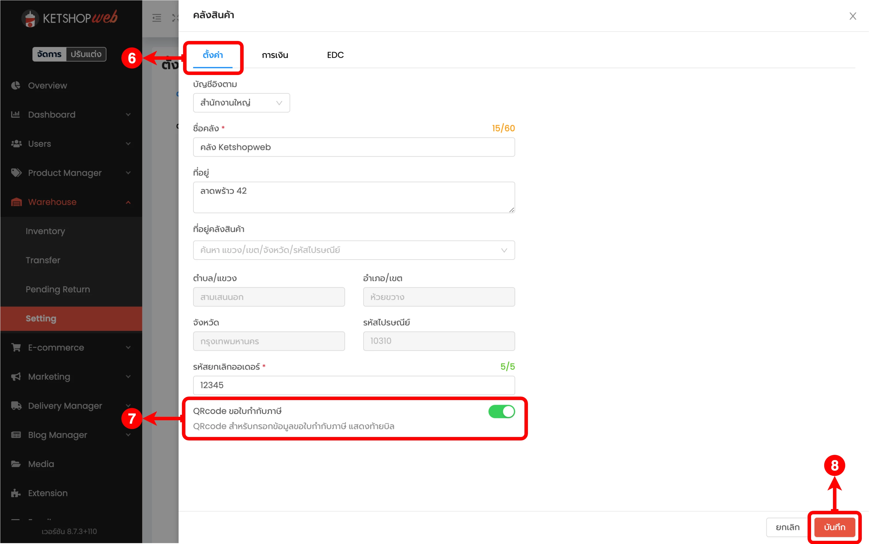 (ตำแหน่งที่ 7) คลิกเพื่อเปิดใช้งาน QR Code ขอใบกำกับภาษี