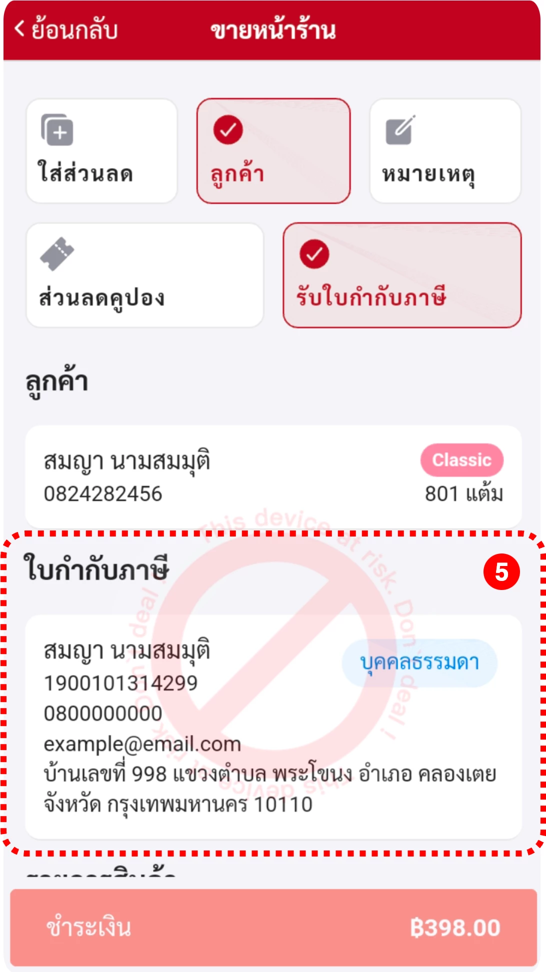 (ตำแหน่งที่ 5) เมื่อกรอกข้อมูลเสร็จสิ้น รายละเอียดข้อมูลขอใบกำกับภาษีจะแสดงต่อจากข้อมูลลูกค้า