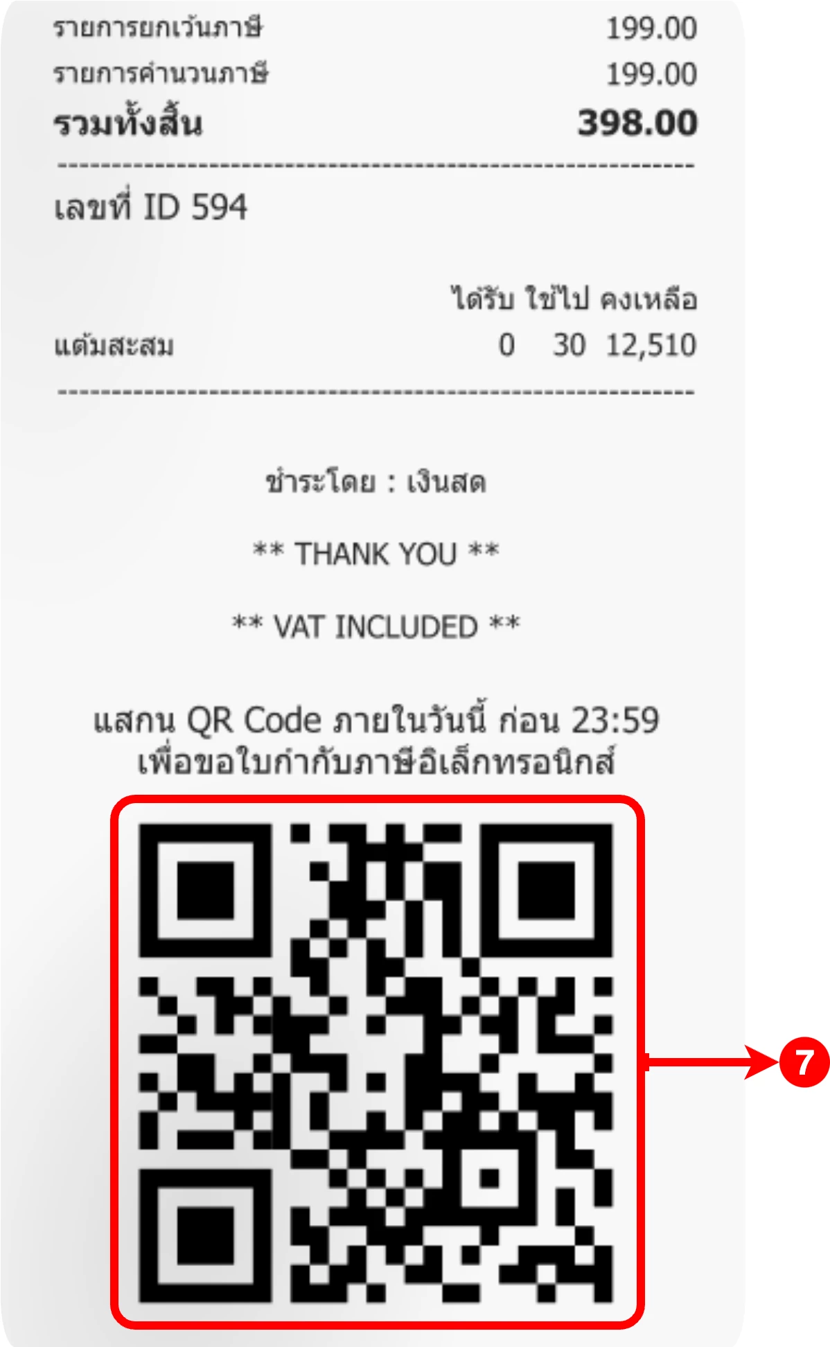 (ตำแหน่งที่ 7) ลูกค้าสามารถสแกน QR Code ที่ท้ายใบเสร็จ เพื่อส่งคำขอใบกำกับภาษีได้