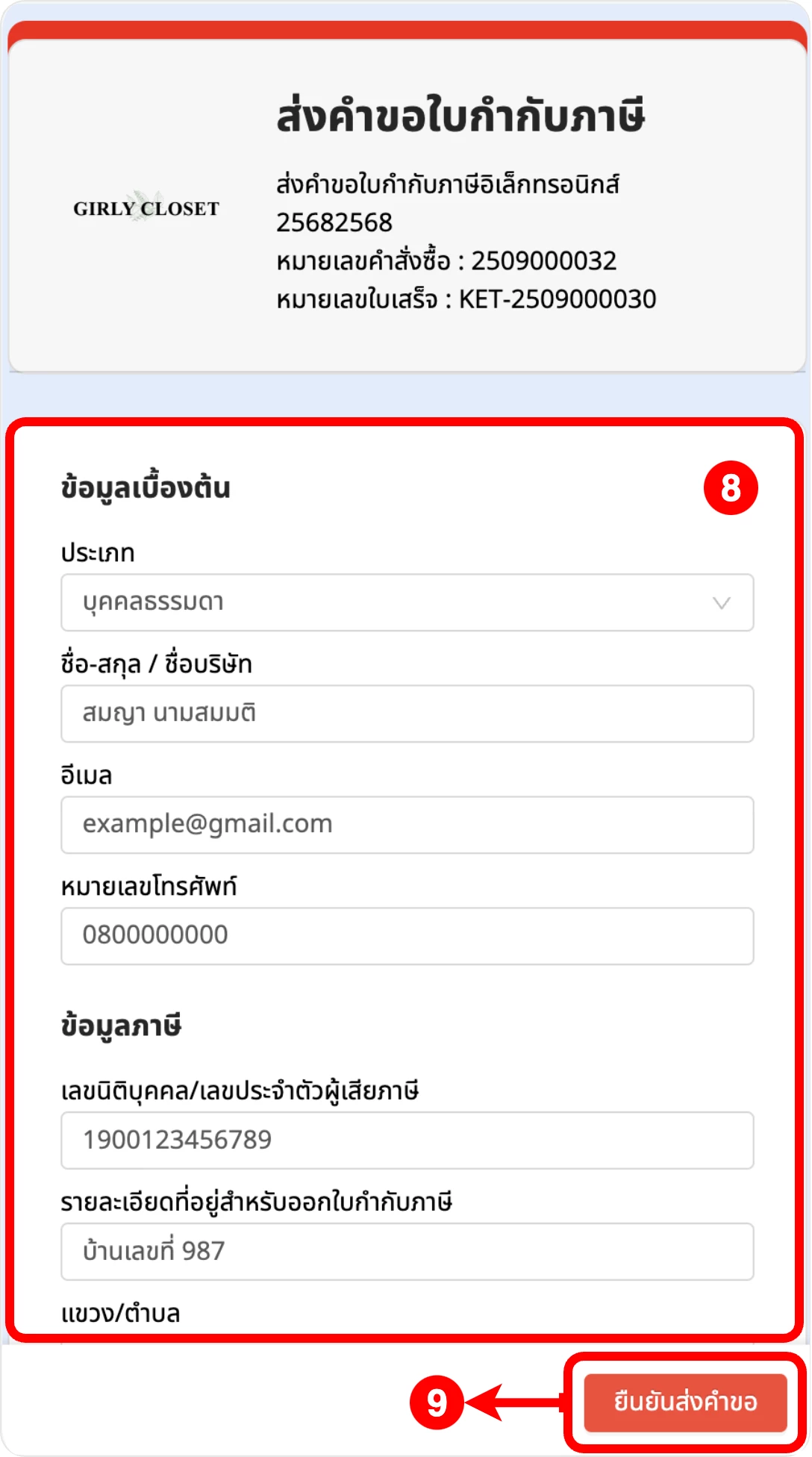 (ตำแหน่งที่ 8) กรอกข้อมูลเพื่อขอใบกำกับภาษีให้ครบถ้วน
