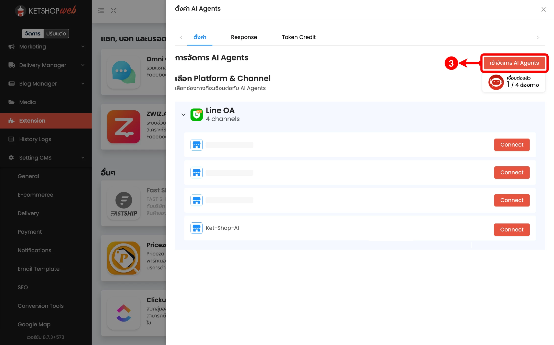 (ตำแหน่งที่ 3) คลิกปุ่ม 'เข้าจัดการ AI Agents'