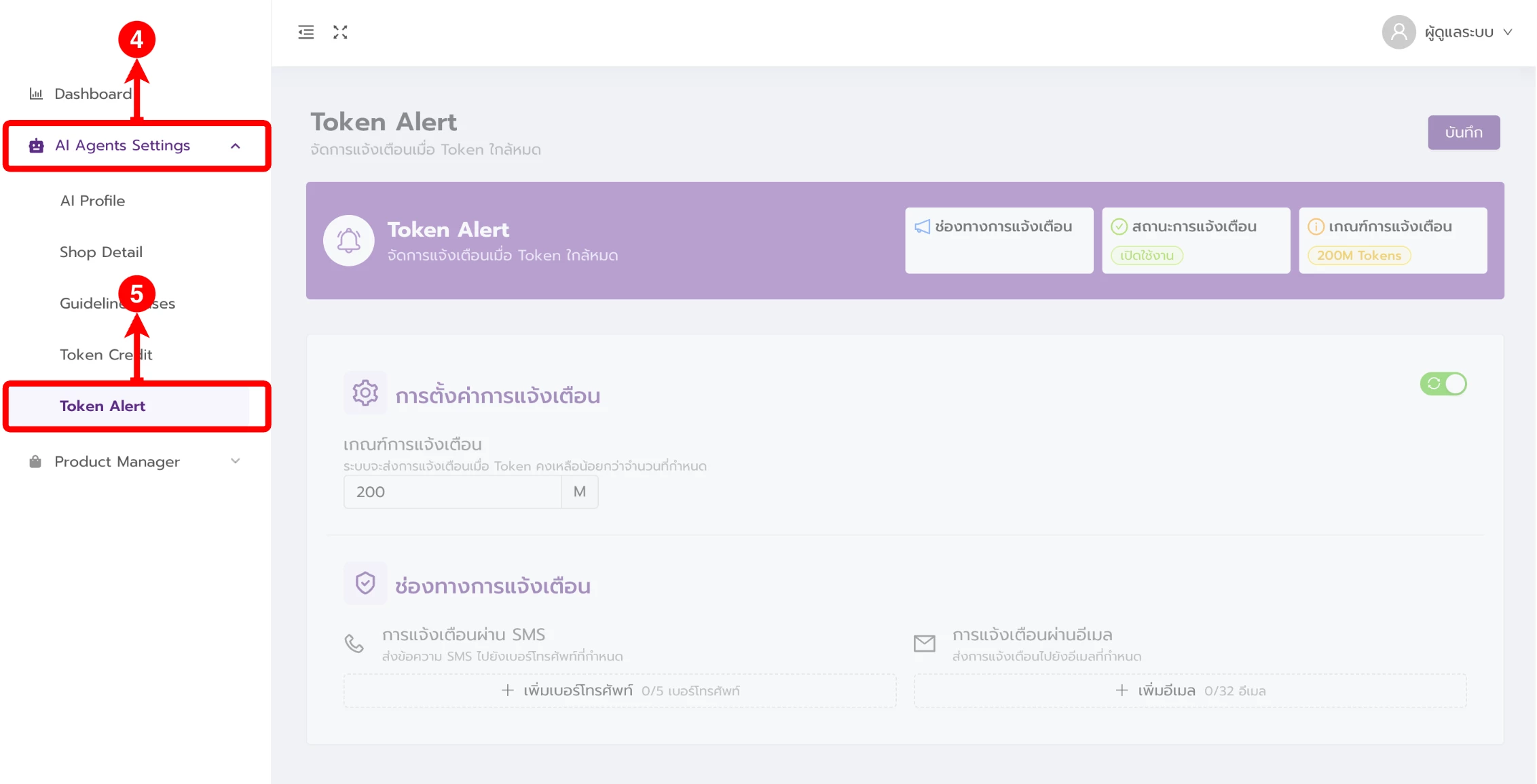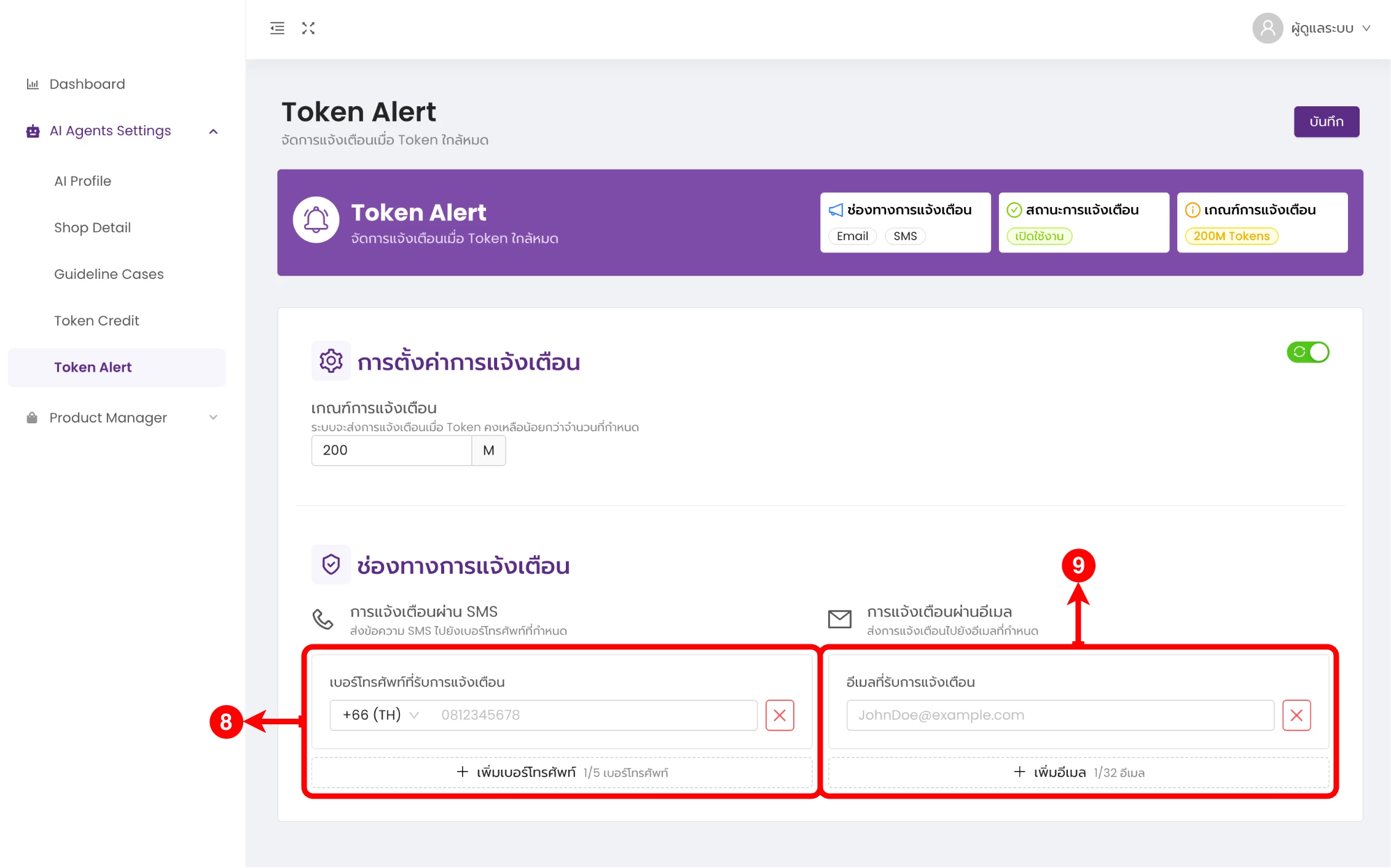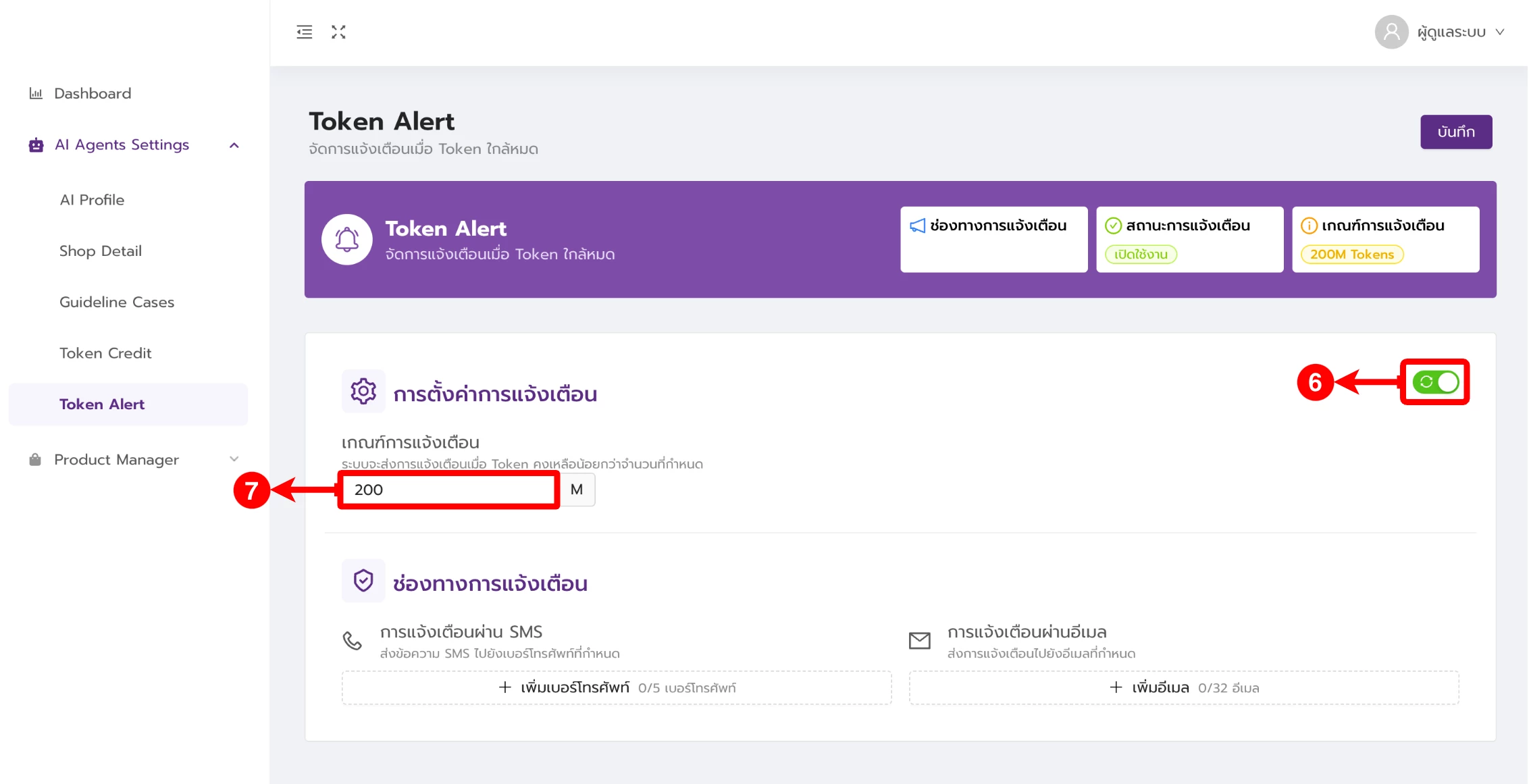 (ตำแหน่งที่ 8) เพิ่มเบอร์โทรศัพท์ที่ต้องการรับข้อความแจ้งเตือน Token ใกล้หมด