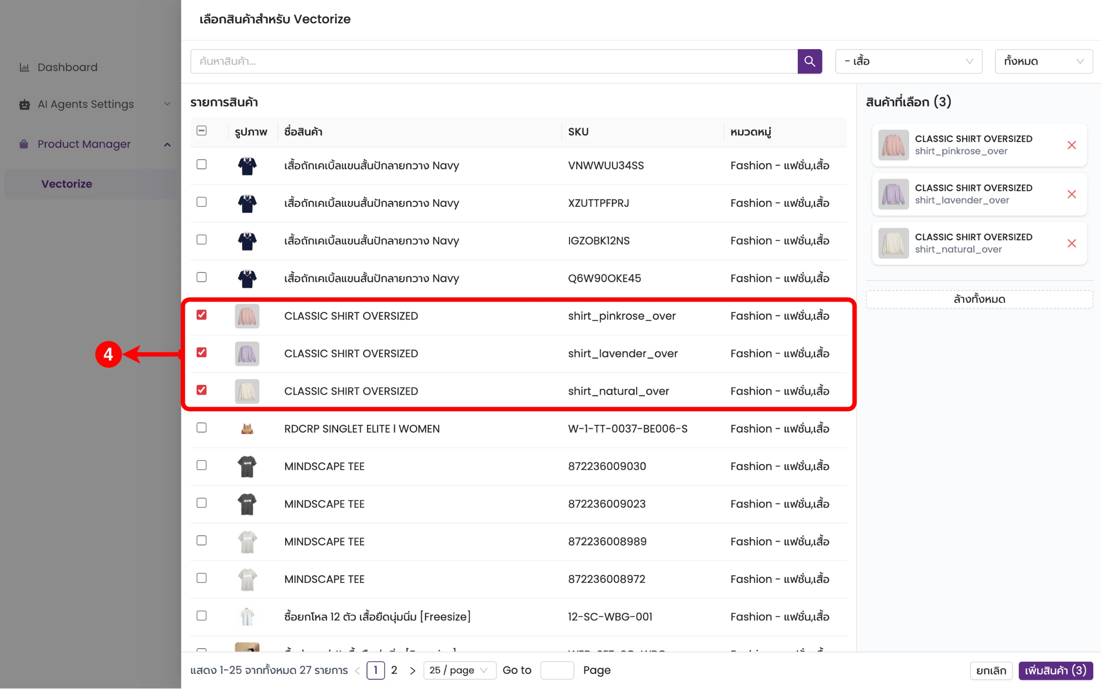 (ตำแหน่งที่ 4) ทำเครื่องหมายถูกหน้าสินค้าที่ต้องการเพิ่มเข้า AI (สินค้าที่เลือกจะแสดงอยู่ทางด้านขวามือ)