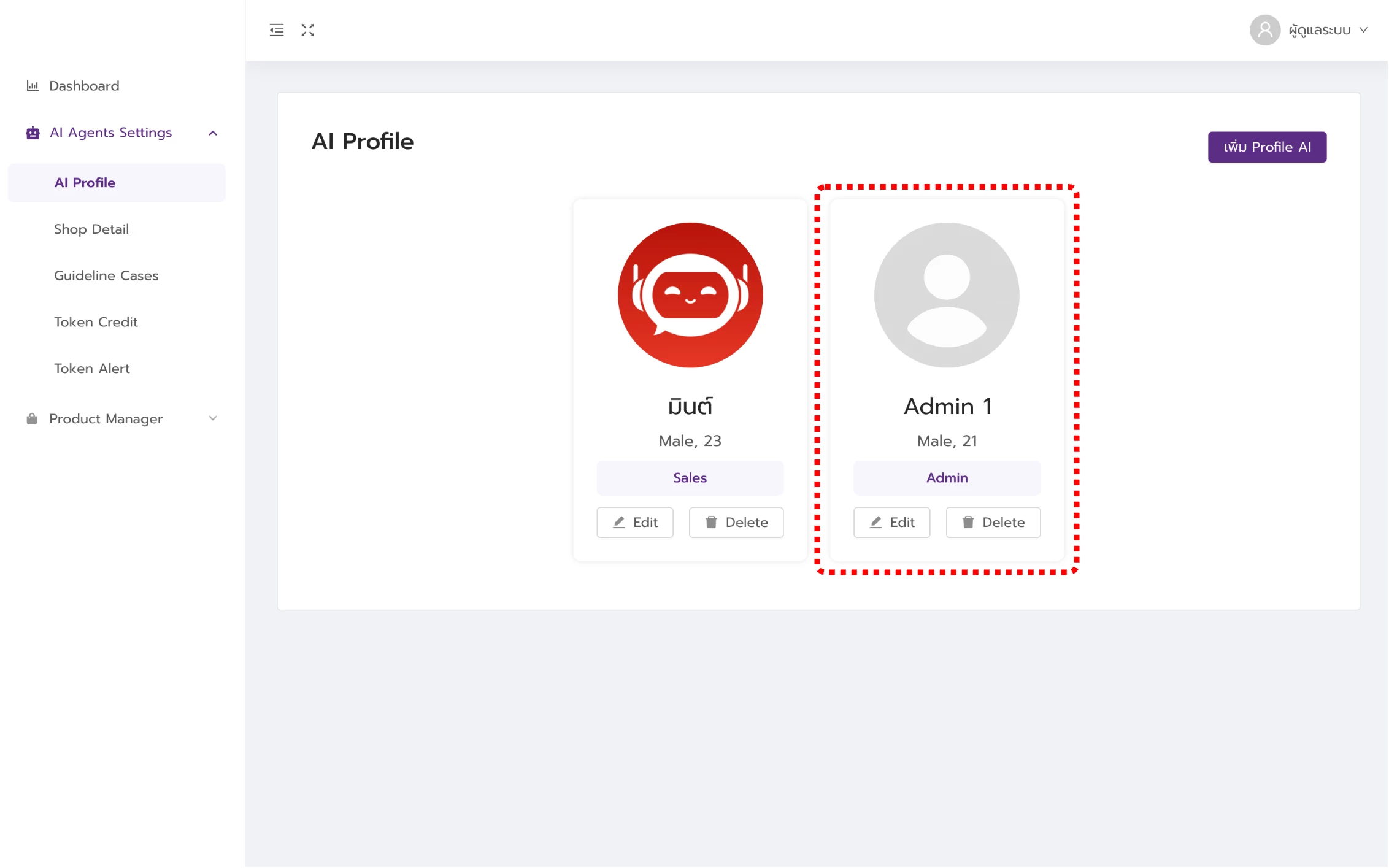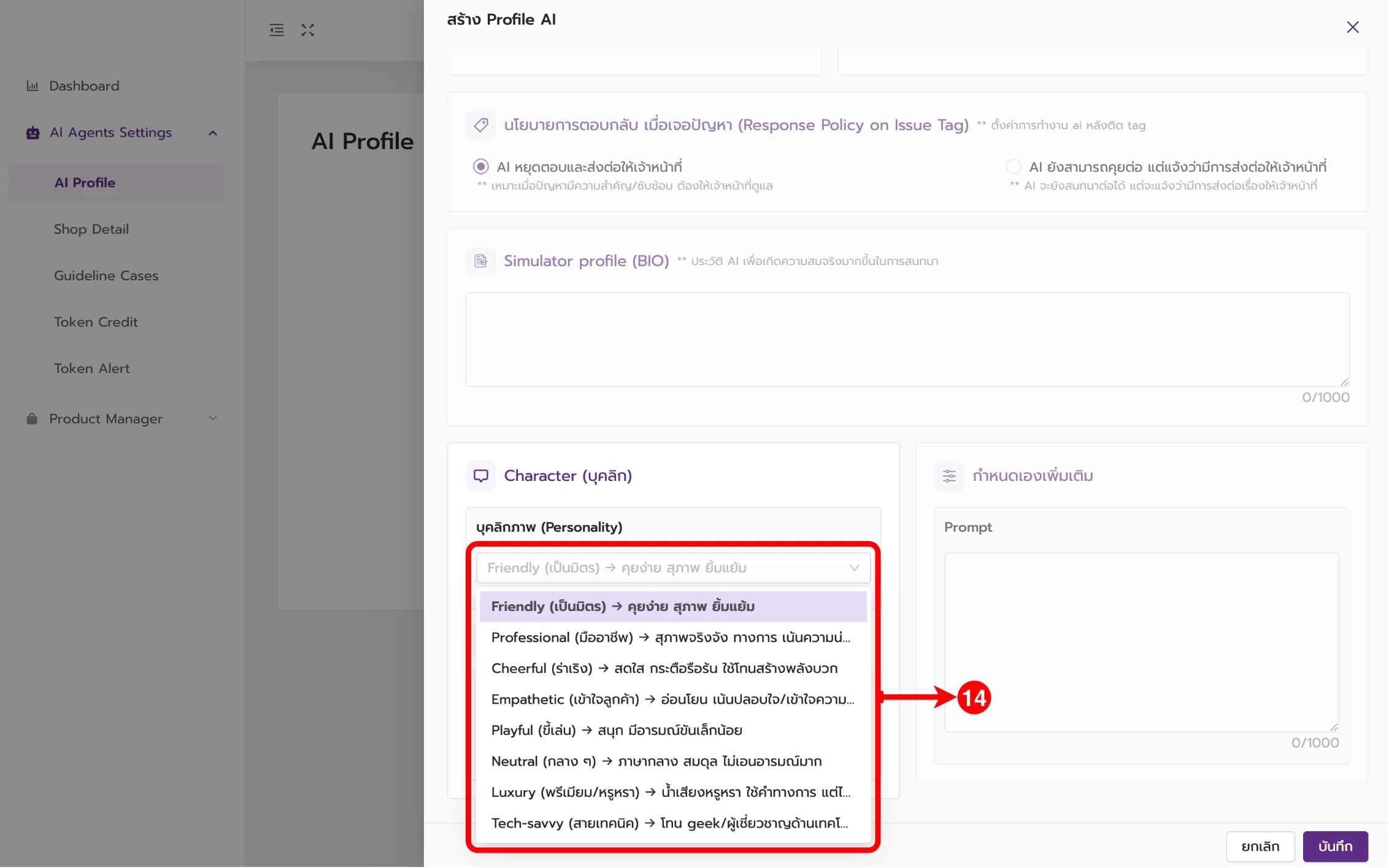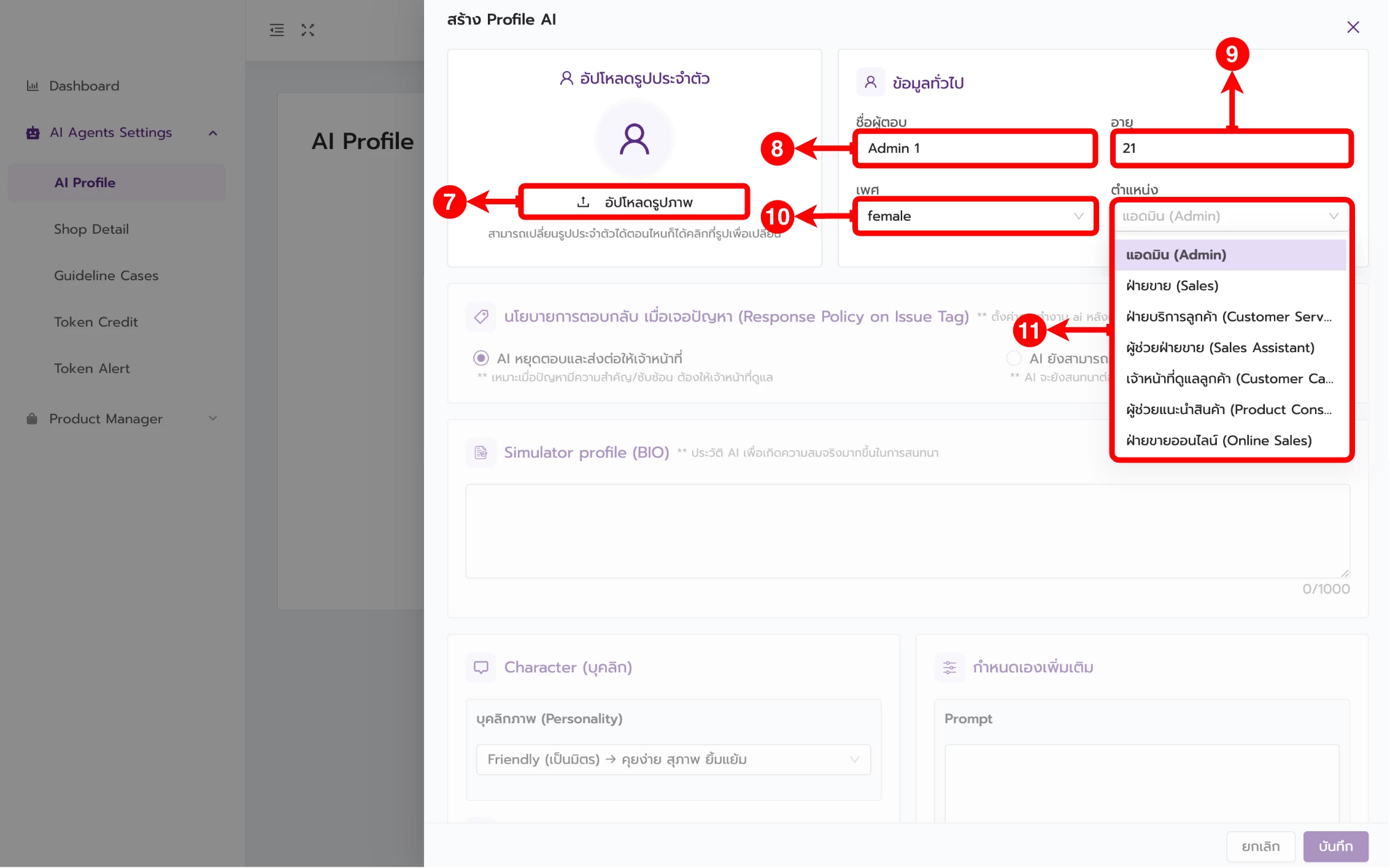 สร้างโปรไฟล์ AI ที่ต้องการ เพื่อกำหนดบุคลิก ลักษณะการสื่อสาร แนวทางการตอบ และรูปแบบการทำงานของ AI ให้เหมาะสมกับร้านค้า และการใช้งาน โดยสามารถตั้งชื่อ AI, อายุ, เพศ และข้อมูลต่าง ๆ ได้ตามที่ต้องการ