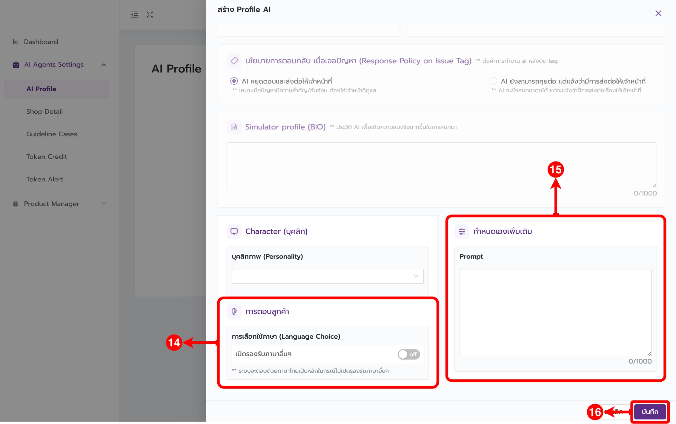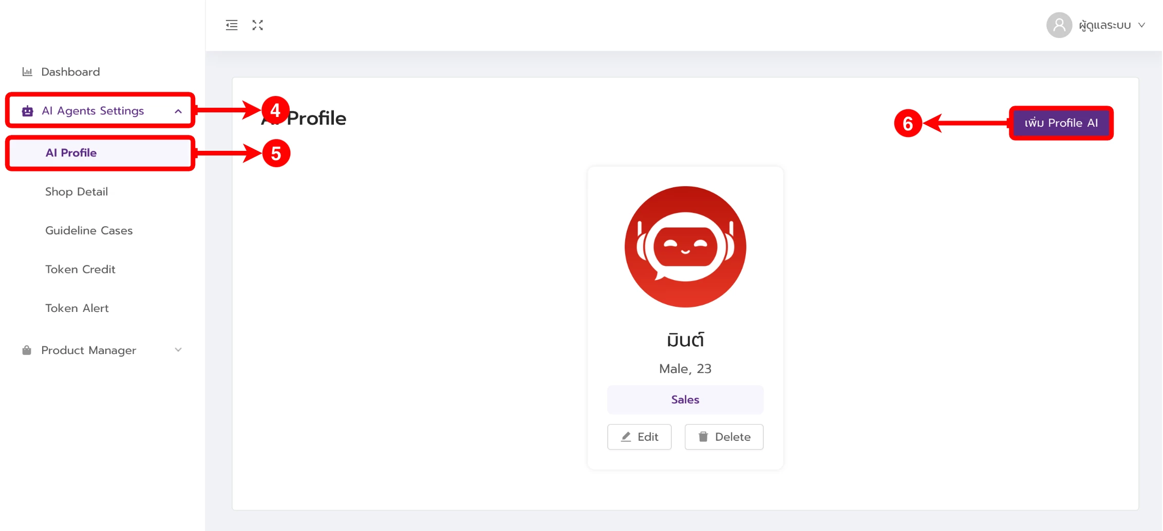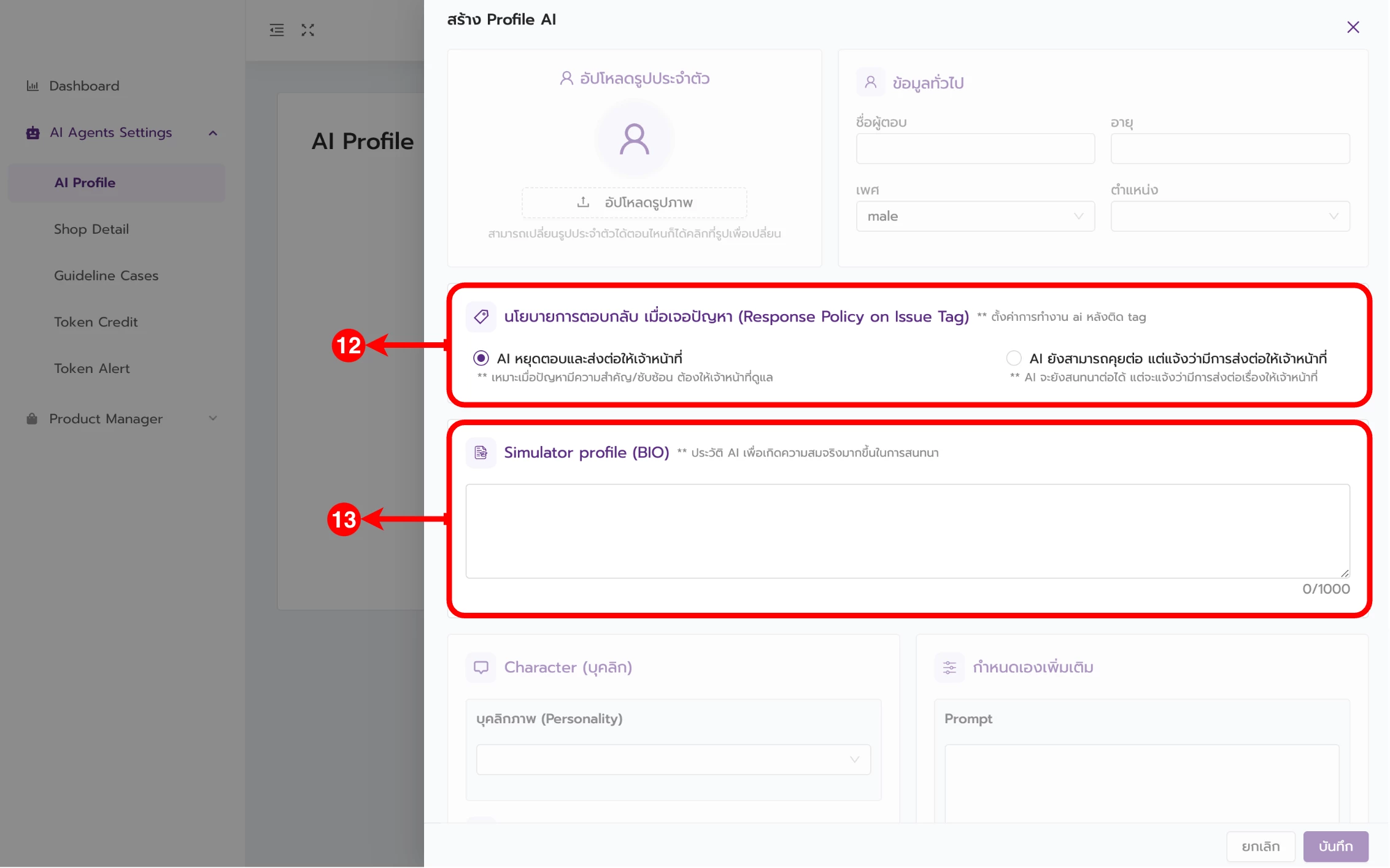 สร้างโปรไฟล์ AI ที่ต้องการ เพื่อกำหนดบุคลิก ลักษณะการสื่อสาร แนวทางการตอบ และรูปแบบการทำงานของ AI ให้เหมาะสมกับร้านค้า และการใช้งาน โดยสามารถตั้งชื่อ AI, อายุ, เพศ และข้อมูลต่าง ๆ ได้ตามที่ต้องการ