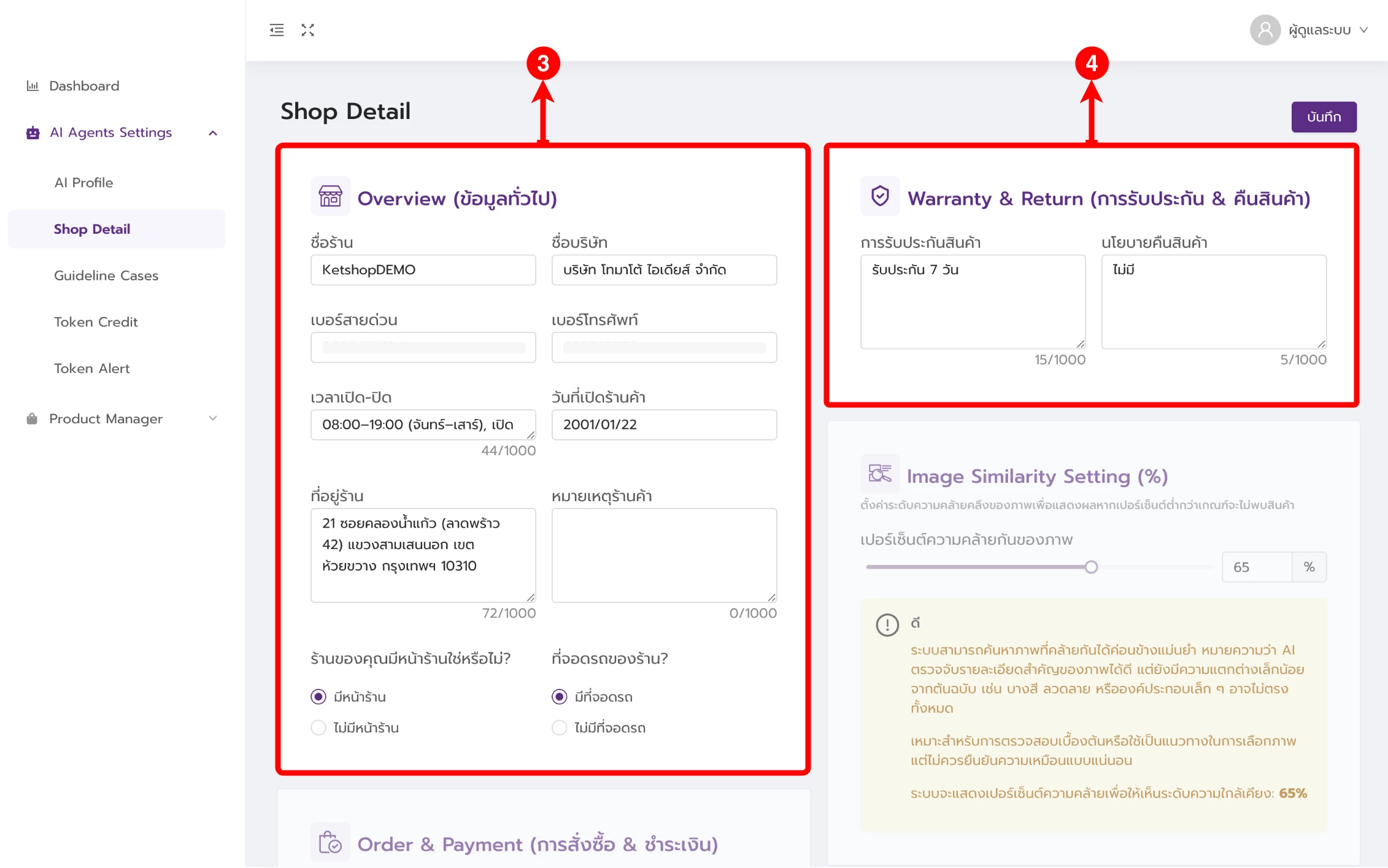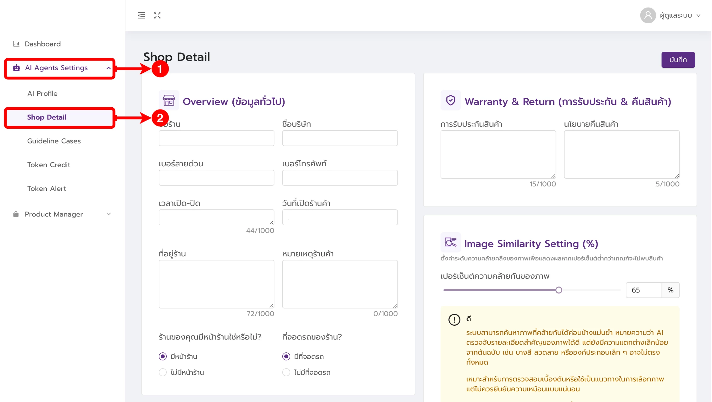 (ตำแหน่งที่ 5) กำหนดเปอร์เซ็นต์ความคล้ายกันของภาพ 'Image Similarity Setting (%)' เพื่อให้ AI สามารถค้นหาสินค้าจากภาพได้อย่างแม่นยำ **แนะนำให้ตั้งค่าเปอร์เซ็นต์ความคล้ายกันของภาพที่ 65%
