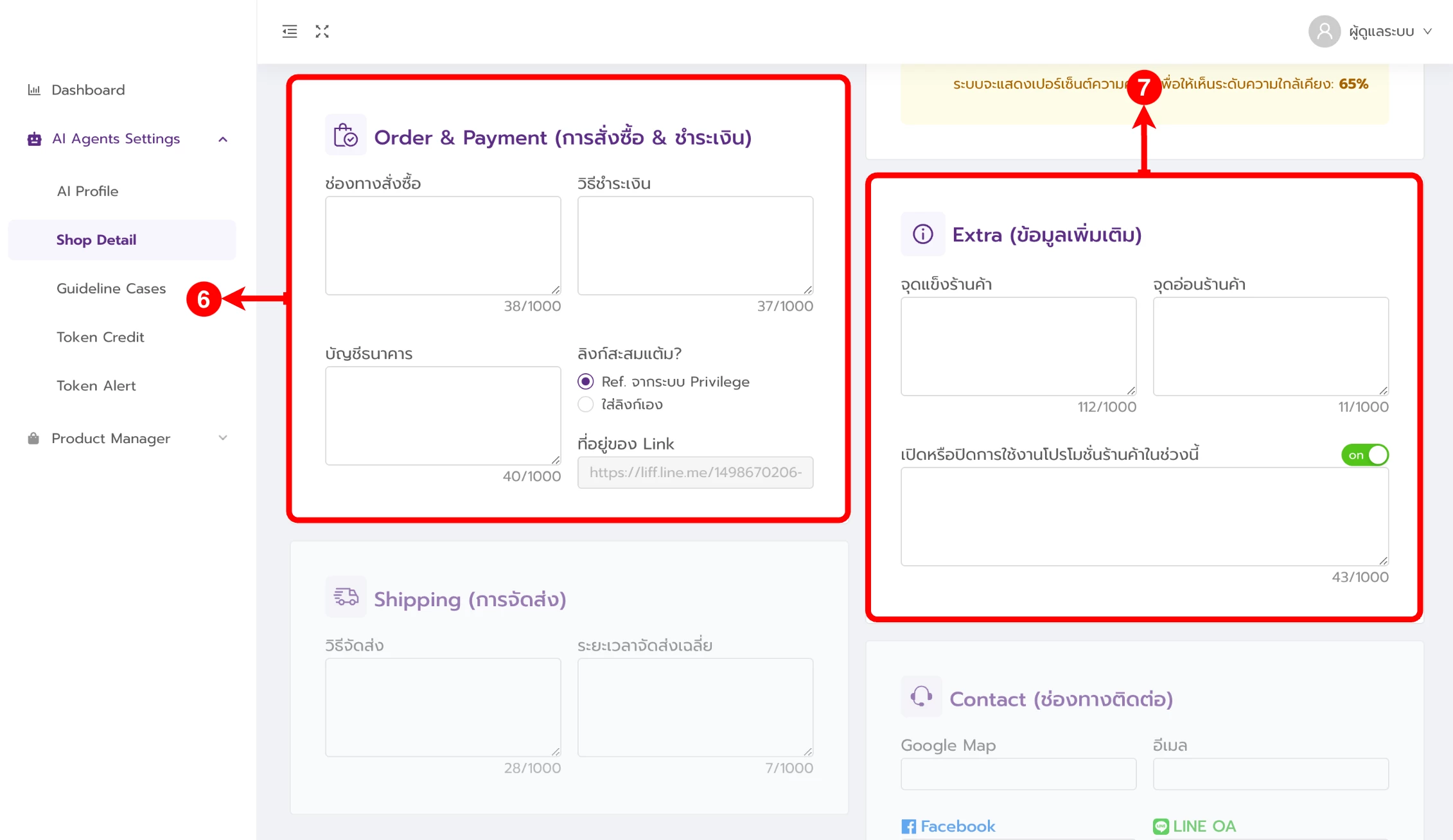 (ตำแหน่งที่ 6) กรอกข้อมูลเกี่ยวกับคำสั่งซื้อ การสะสมแต้ม และการชำระเงิน เพื่อให้ AI สามารถตอบกลับ