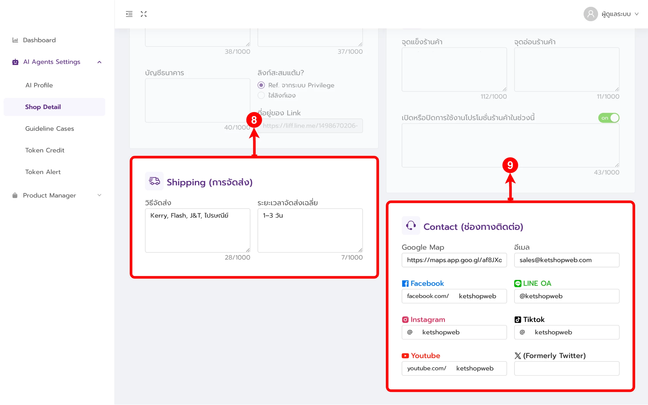 (ตำแหน่งที่ 9) กรอกช่องทางติดต่อของร้านค้า เพื่อแสดงช่องทางติดต่อเพิ่มเติม