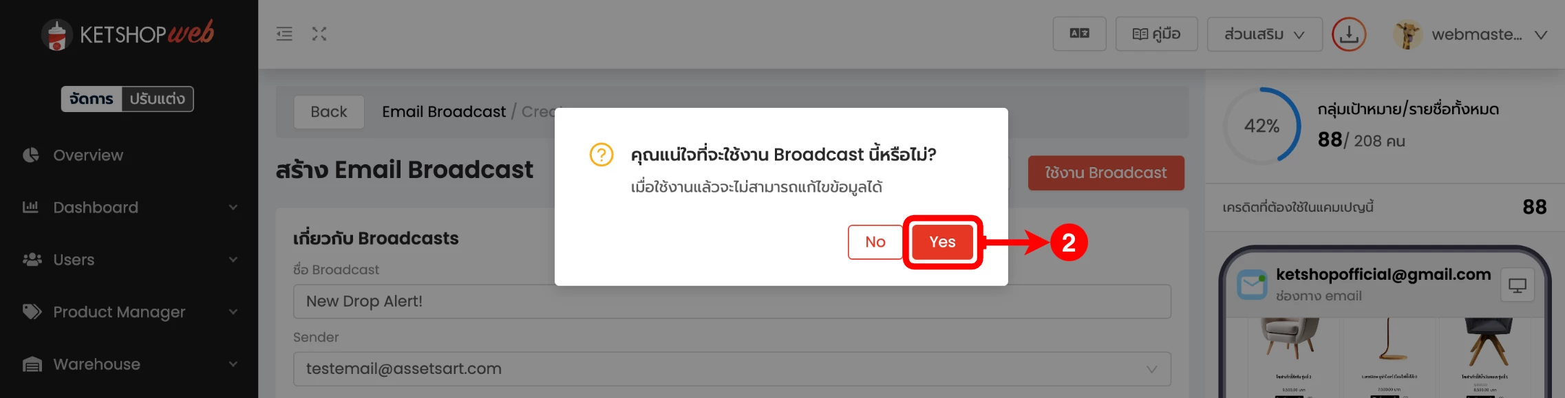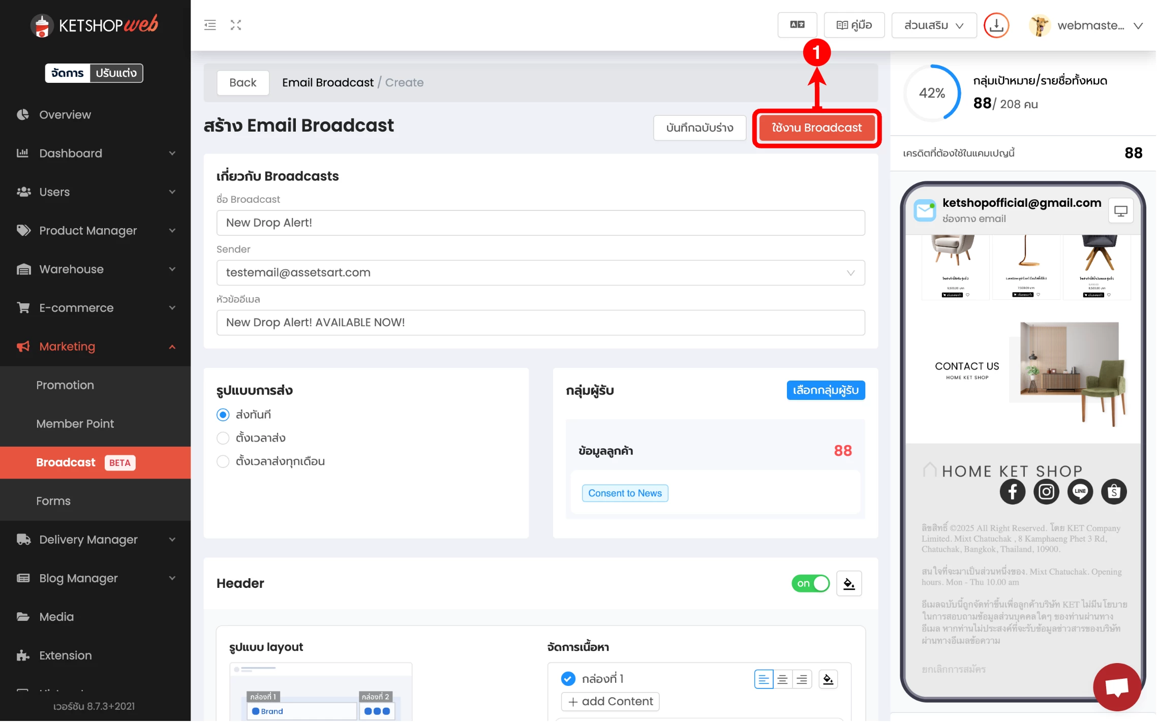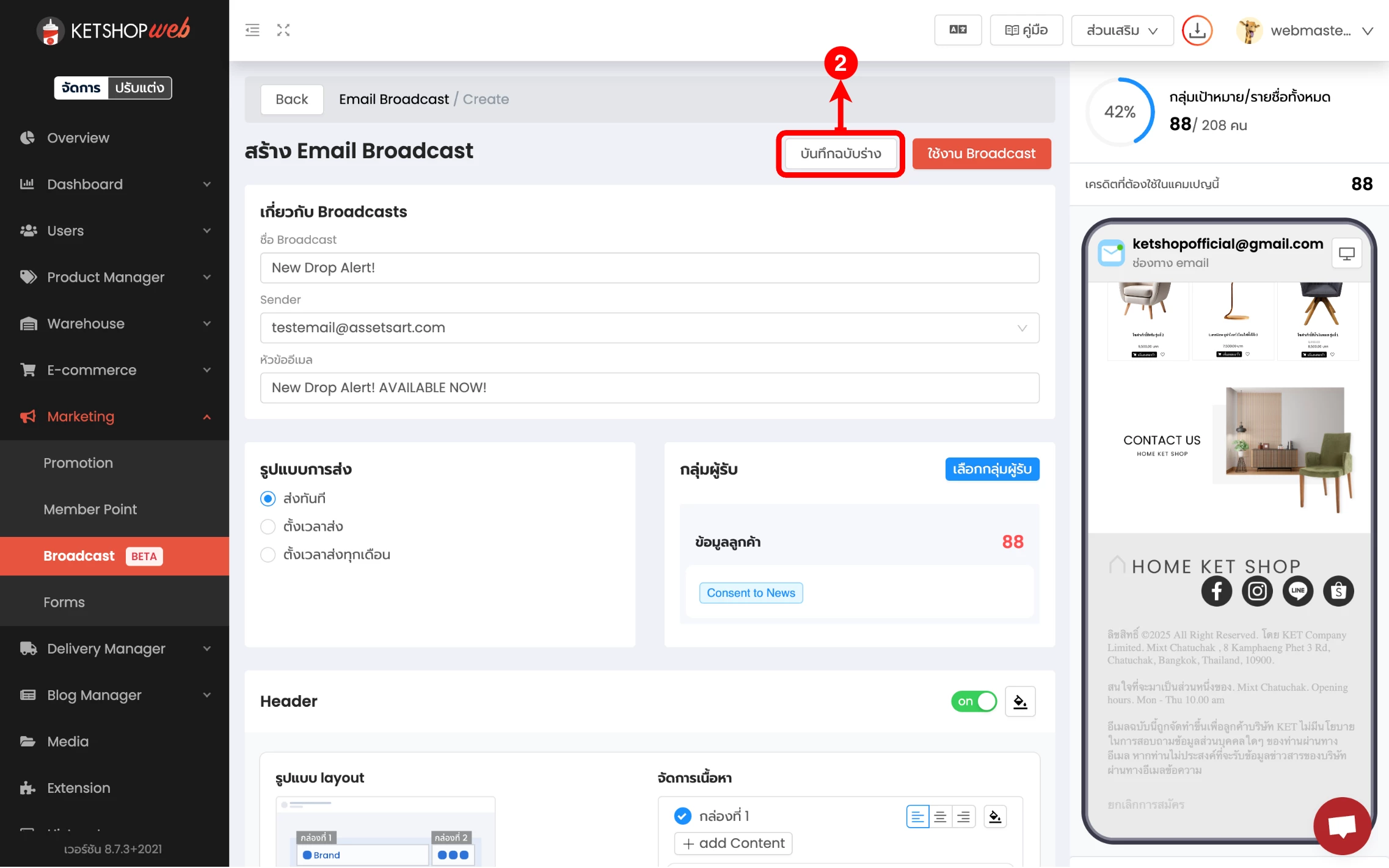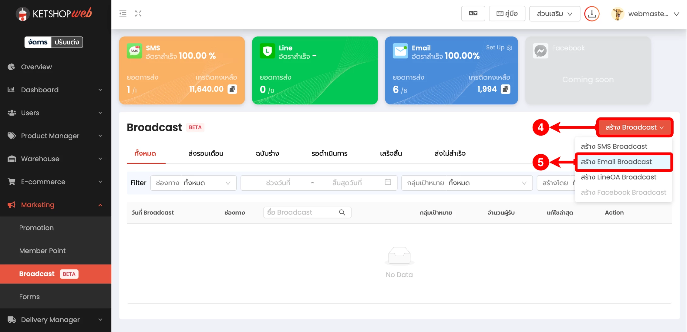 (ตำแหน่งที่ 5) เลือก 'สร้าง Email Broadcast'