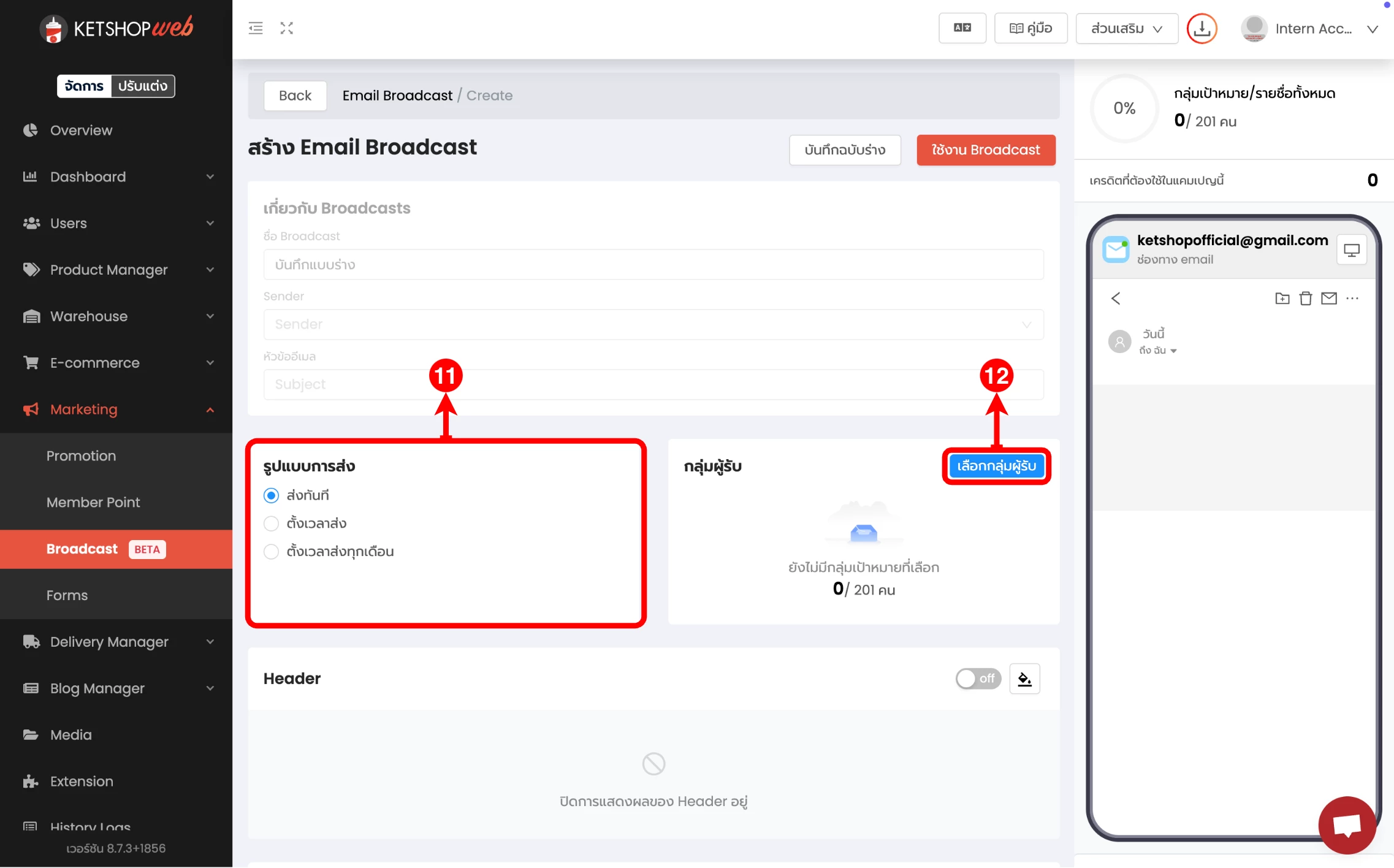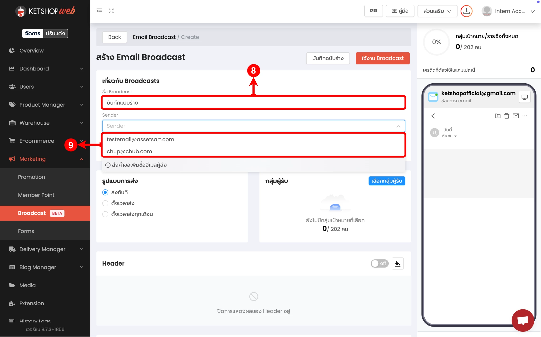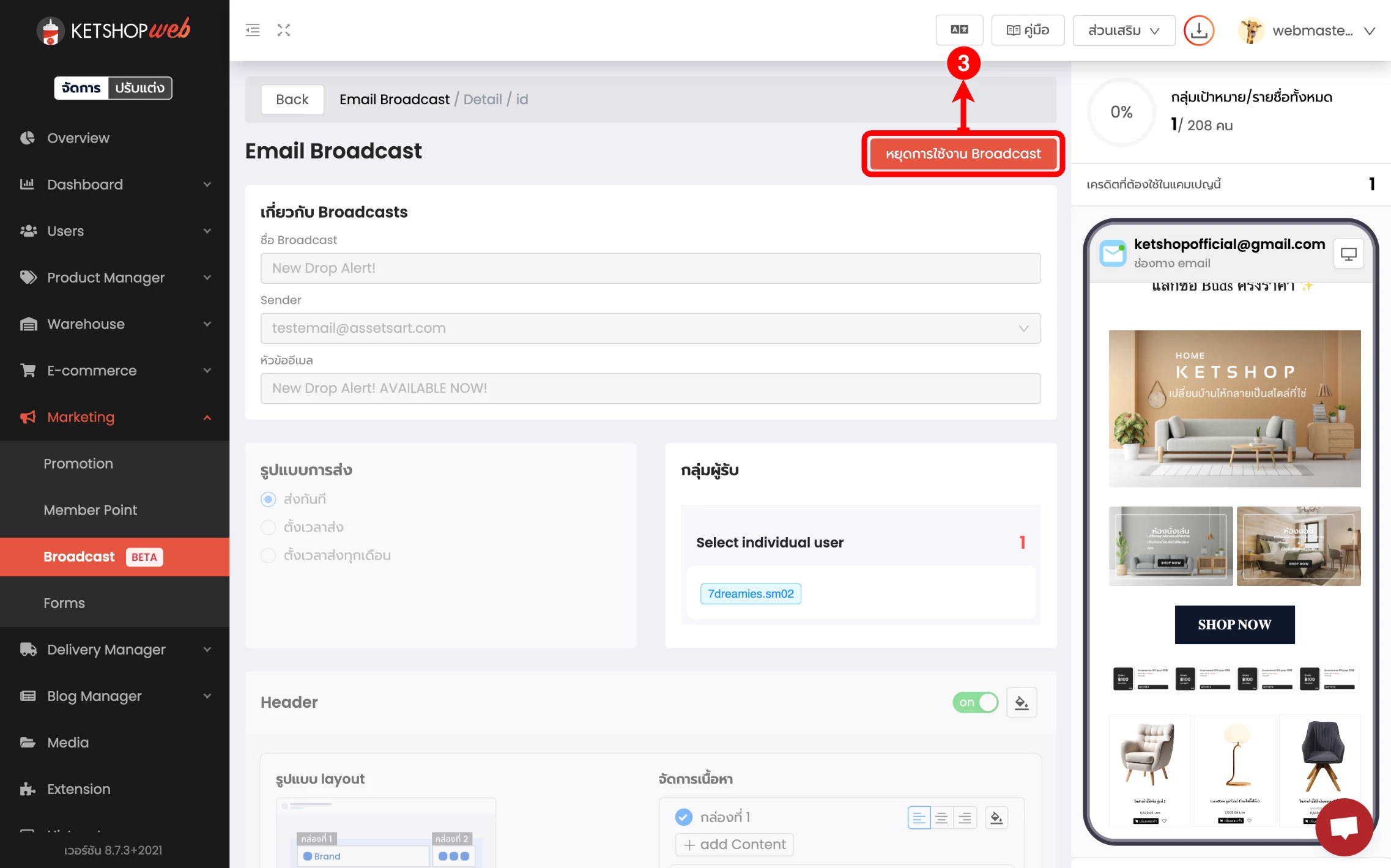 (ตำแหน่งที่ 5) เลือก 'สร้าง Email Broadcast'