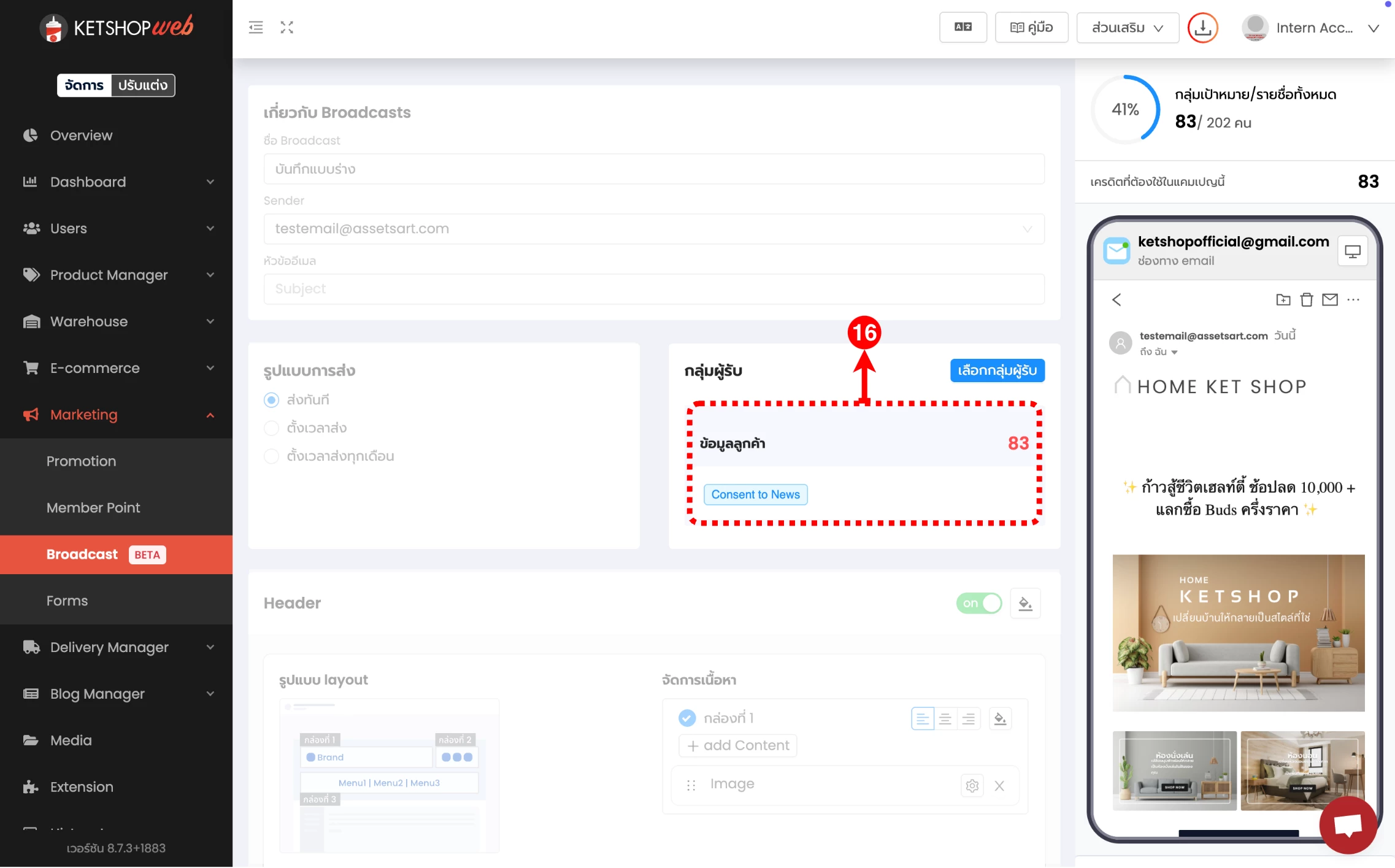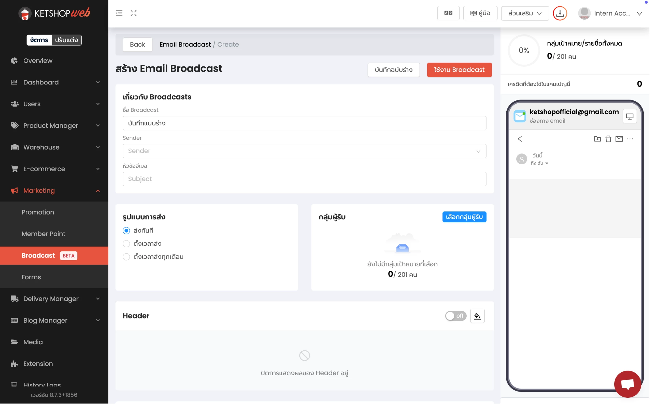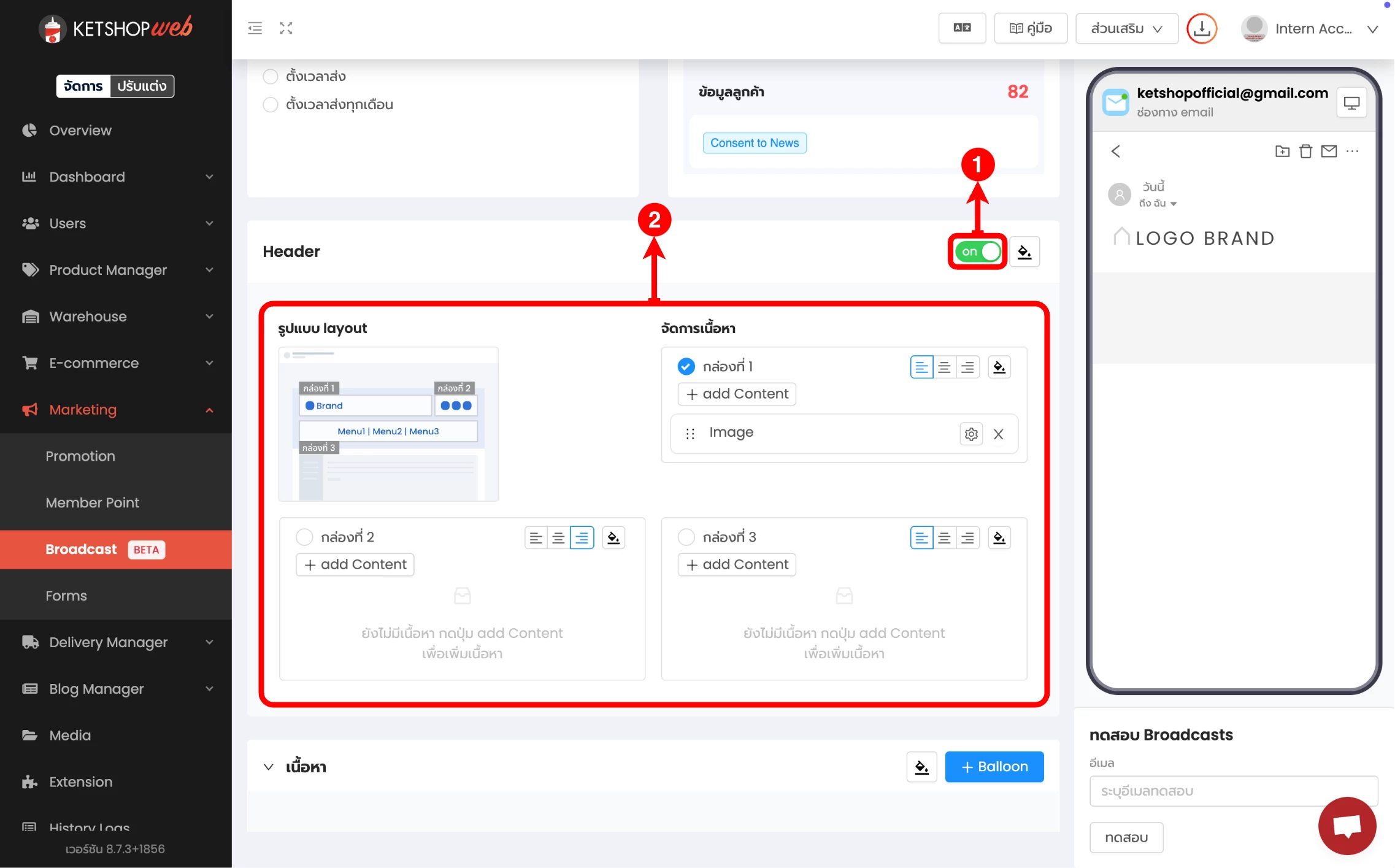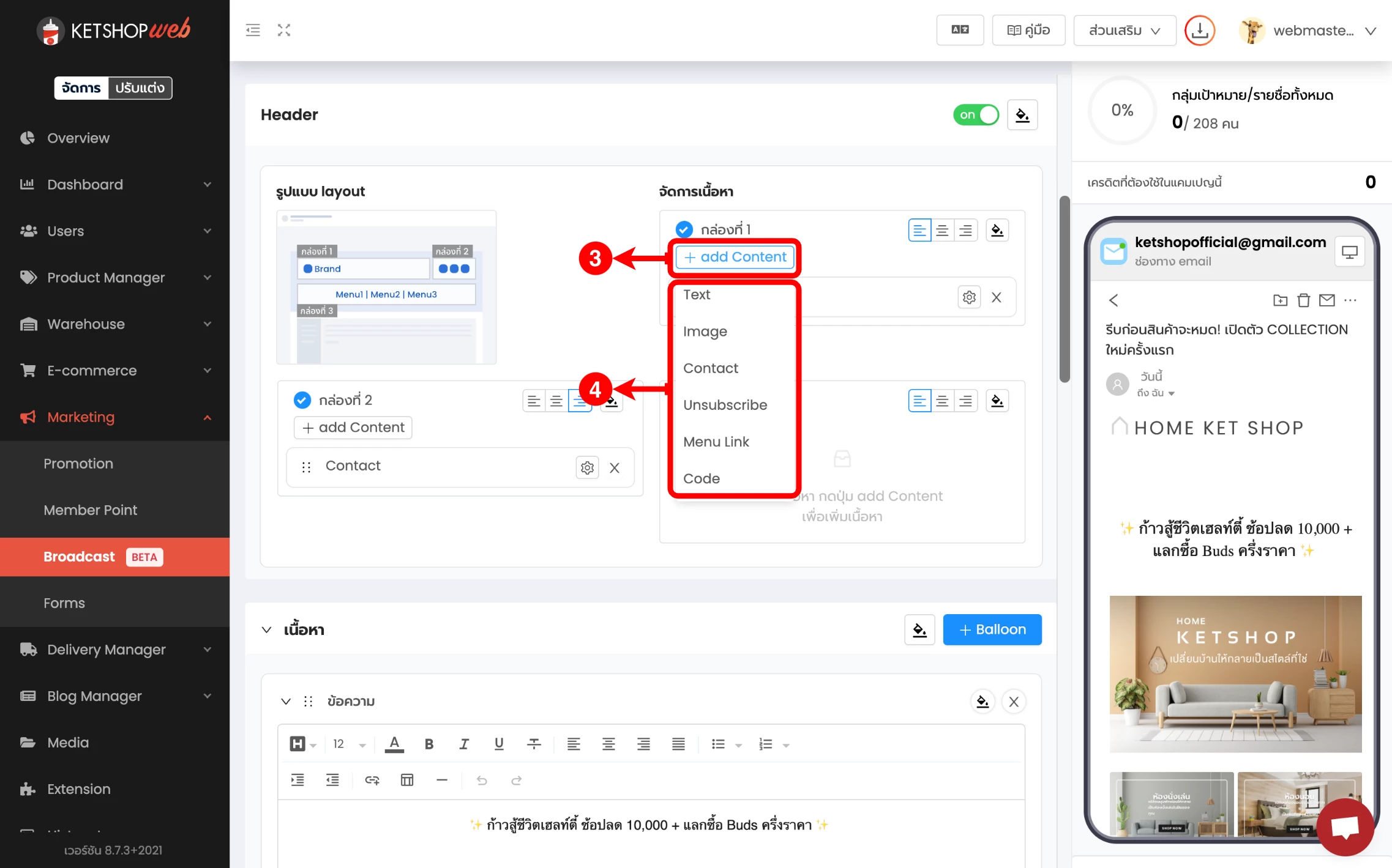 (ตำแหน่งที่ 5) เลือก 'สร้าง Email Broadcast'