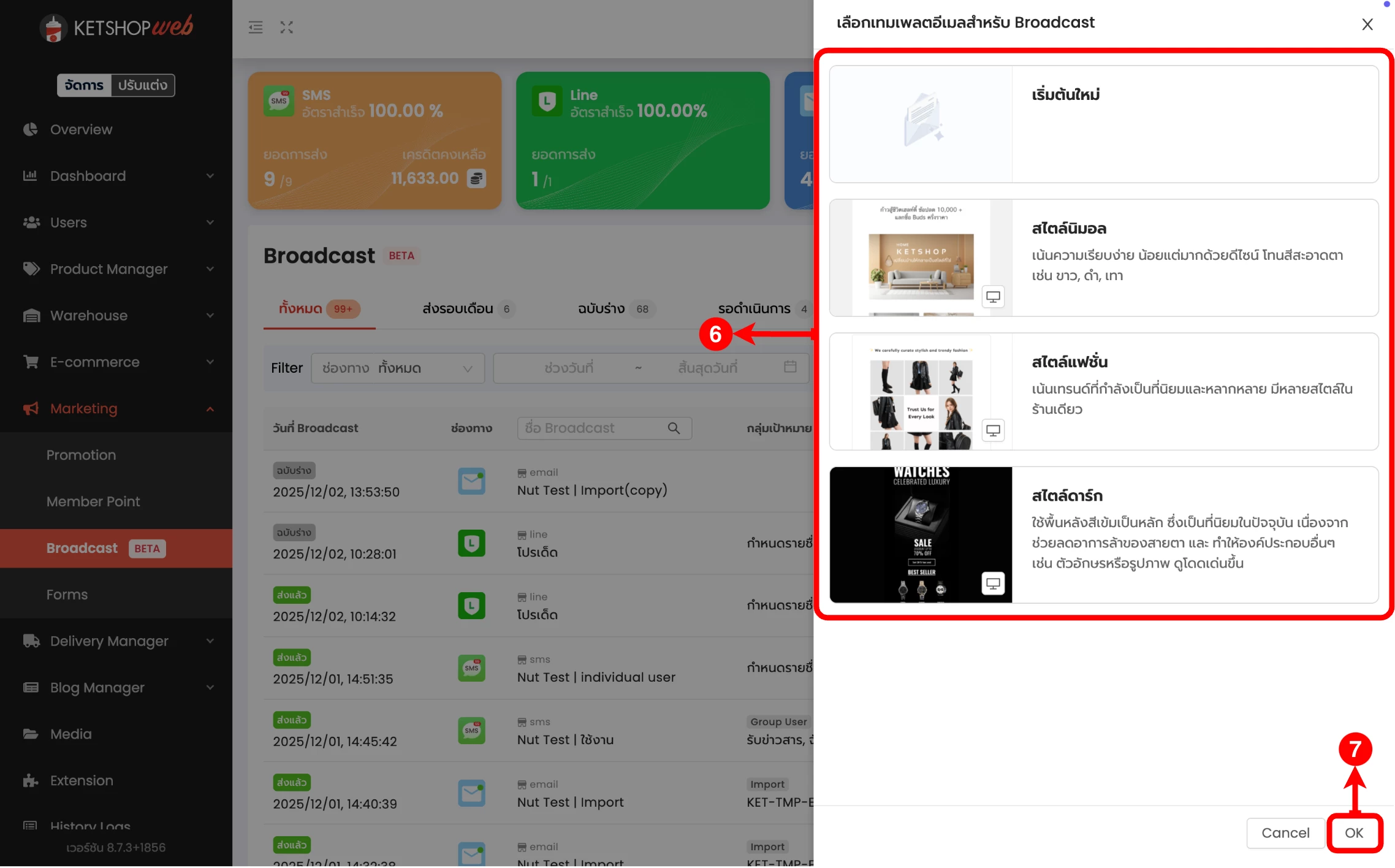 (ตำแหน่งที่ 6) เลือกเทมเพลตอีเมลสำหรับ Broadcast