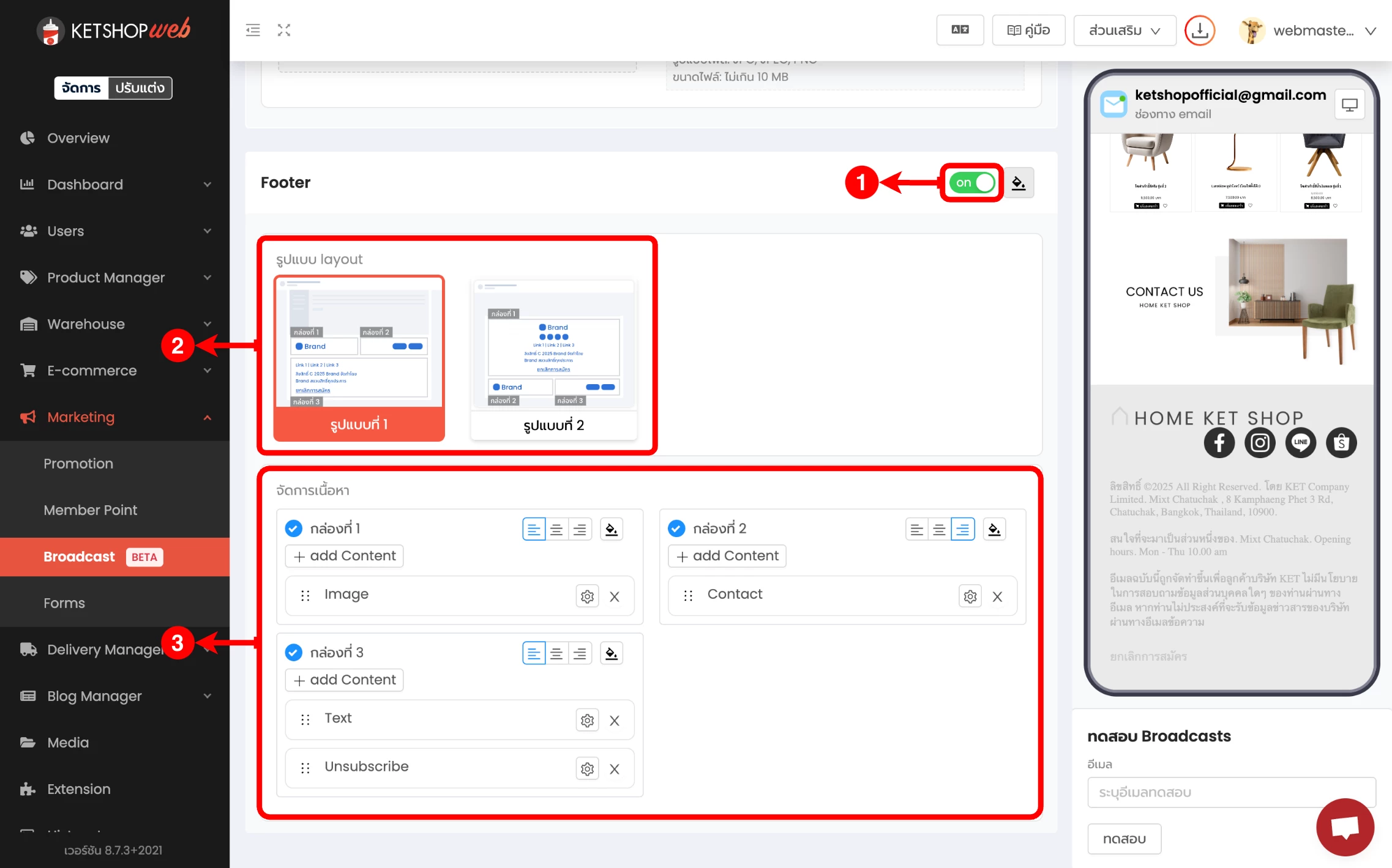 (ตำแหน่งที่ 3) จัดการเนื้อหา Footer โดยมีเนื้อหาทั้งหมด 3 กล่อง (ตามรูปแบบ Layout ที่เลือก)
