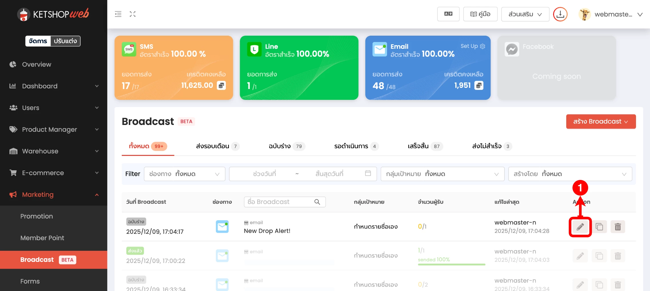 (ตำแหน่งที่ 1) คลิกไอคอนดินสอ เพื่อเข้าหน้ารายละเอียด Broadcast