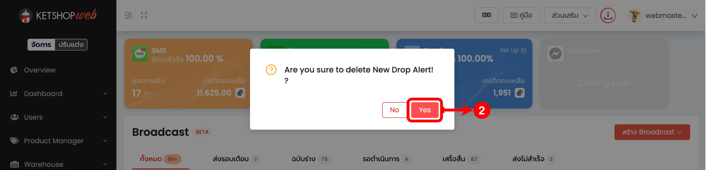 (ตำแหน่งที่ 2) คลิกปุ่ม 'Yes' เพื่อทำการยืนยันการลบ