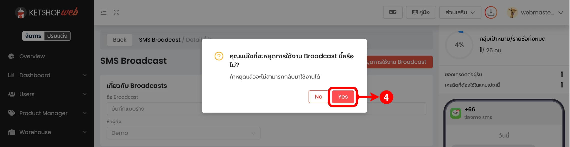 (ตำแหน่งที่ 4) คลิกปุ่ม 'Yes' เพื่อยกเลิก Broadcast