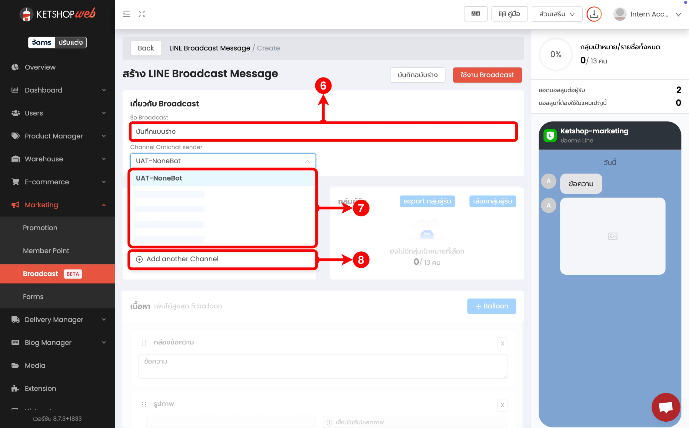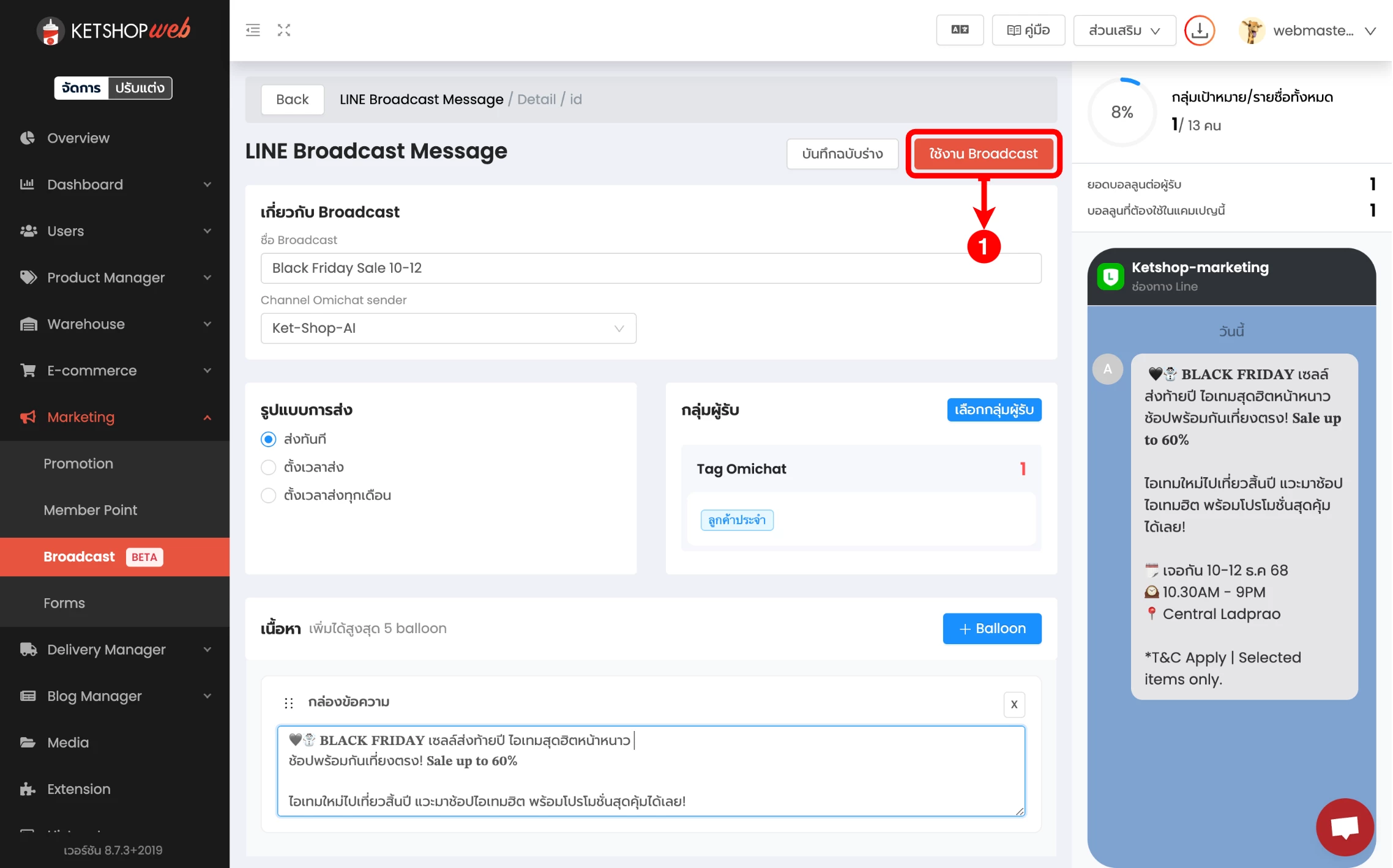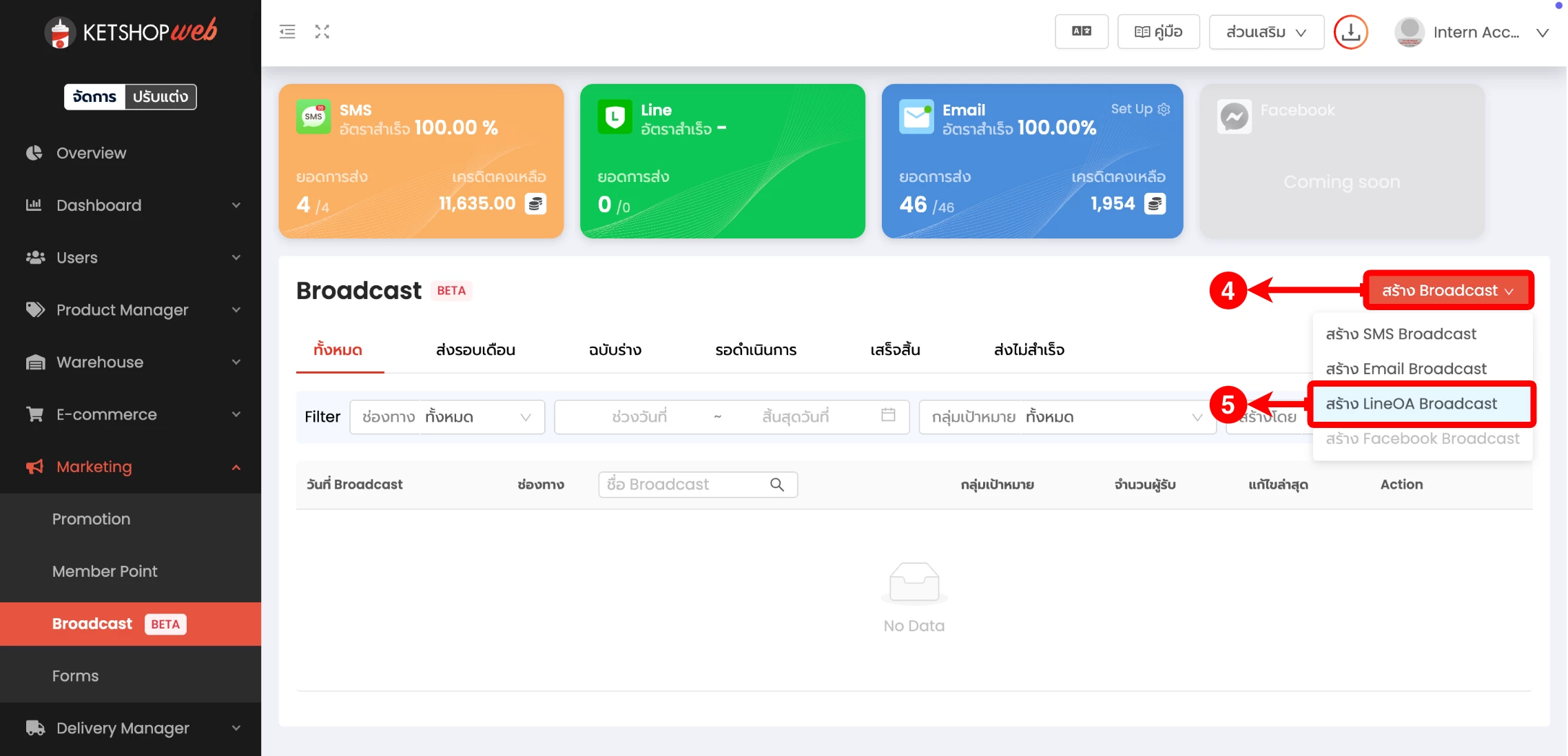 (ตำแหน่งที่ 5) เลือก 'สร้าง LineOA Broadcast'