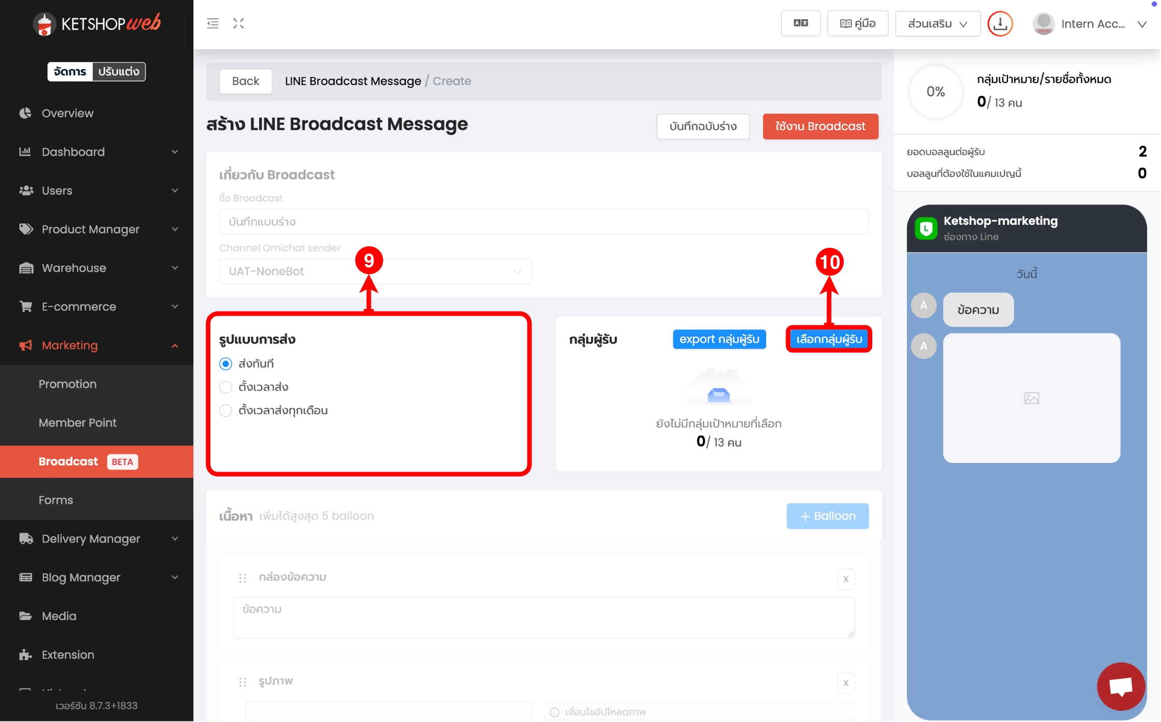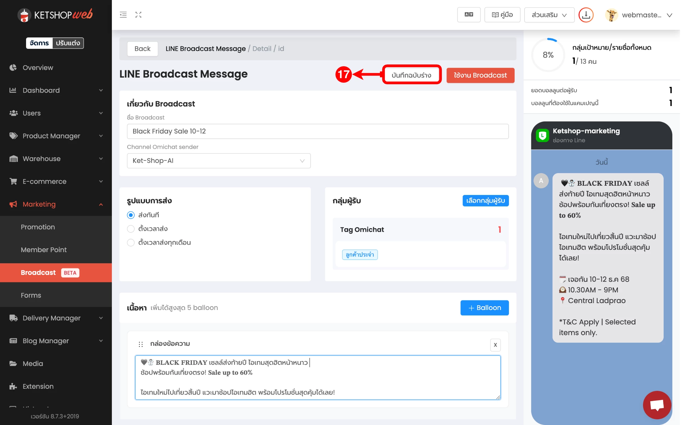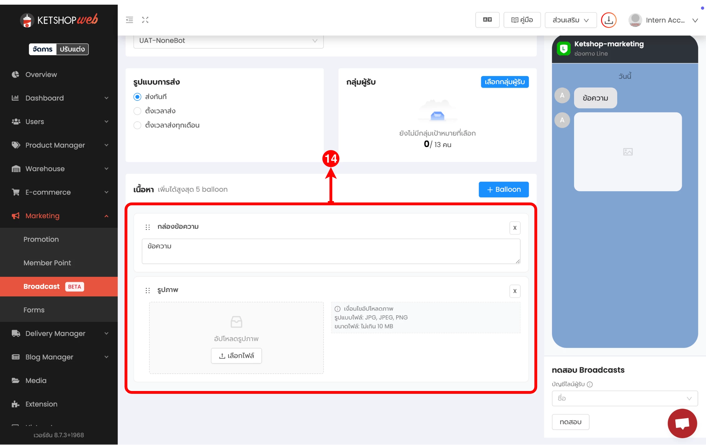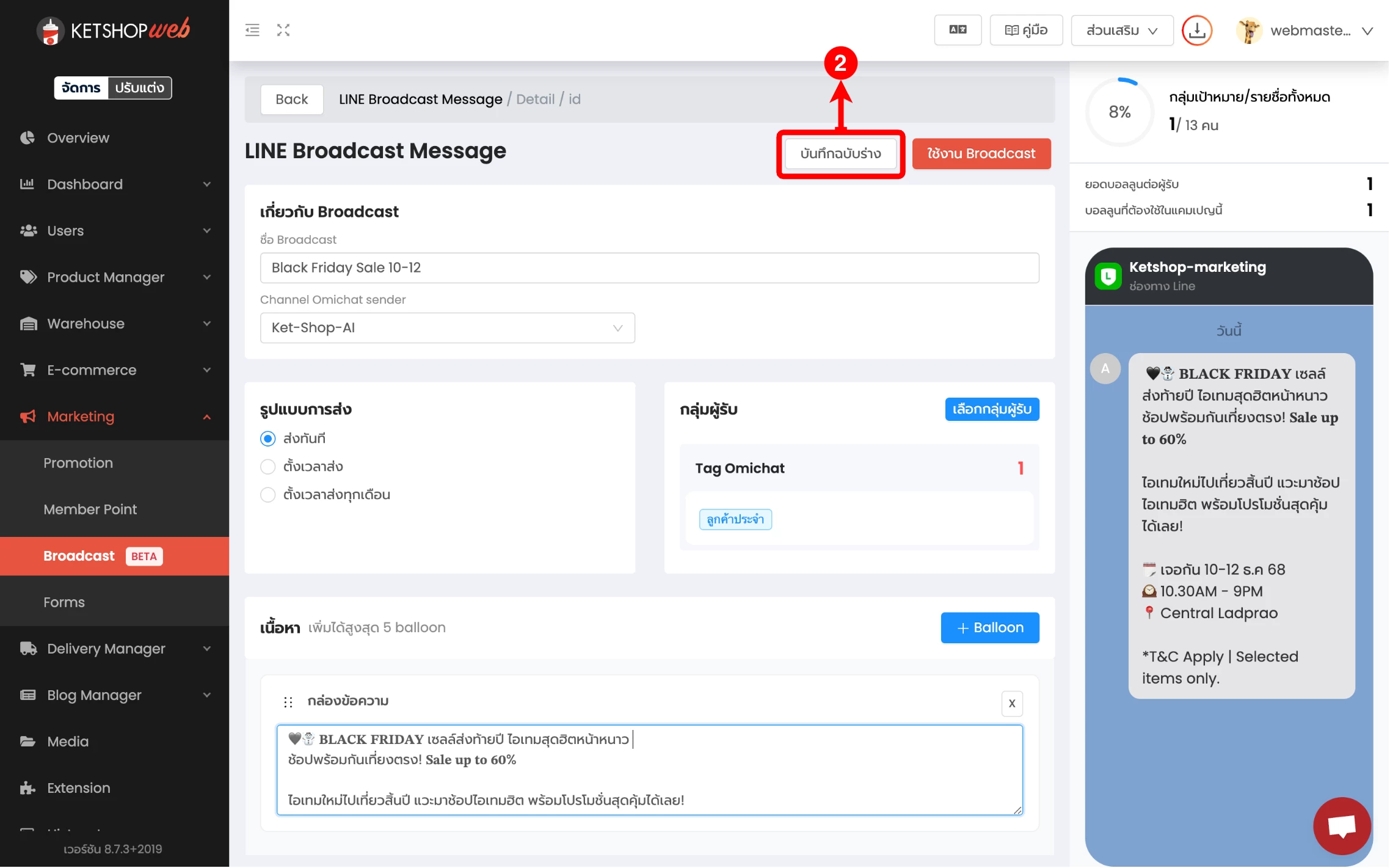 (ตำแหน่งที่ 5) เลือก 'สร้าง LineOA Broadcast'