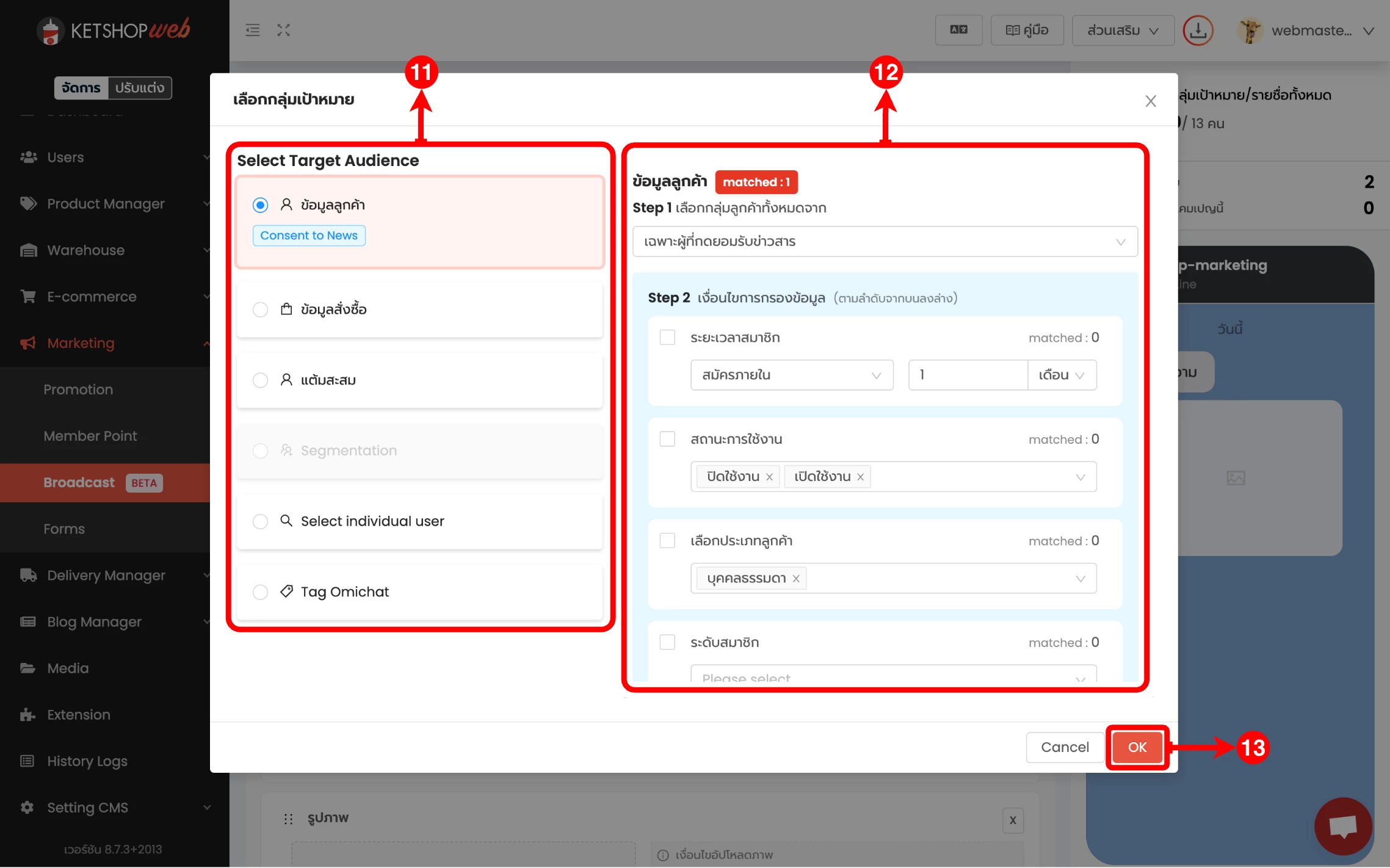 (ตำแหน่งที่ 12) กำหนดเงื่อนไขการกรองข้อมูลลูกค้า โดยสามารถเลือกได้หลายเงื่อนไขพร้อมกัน