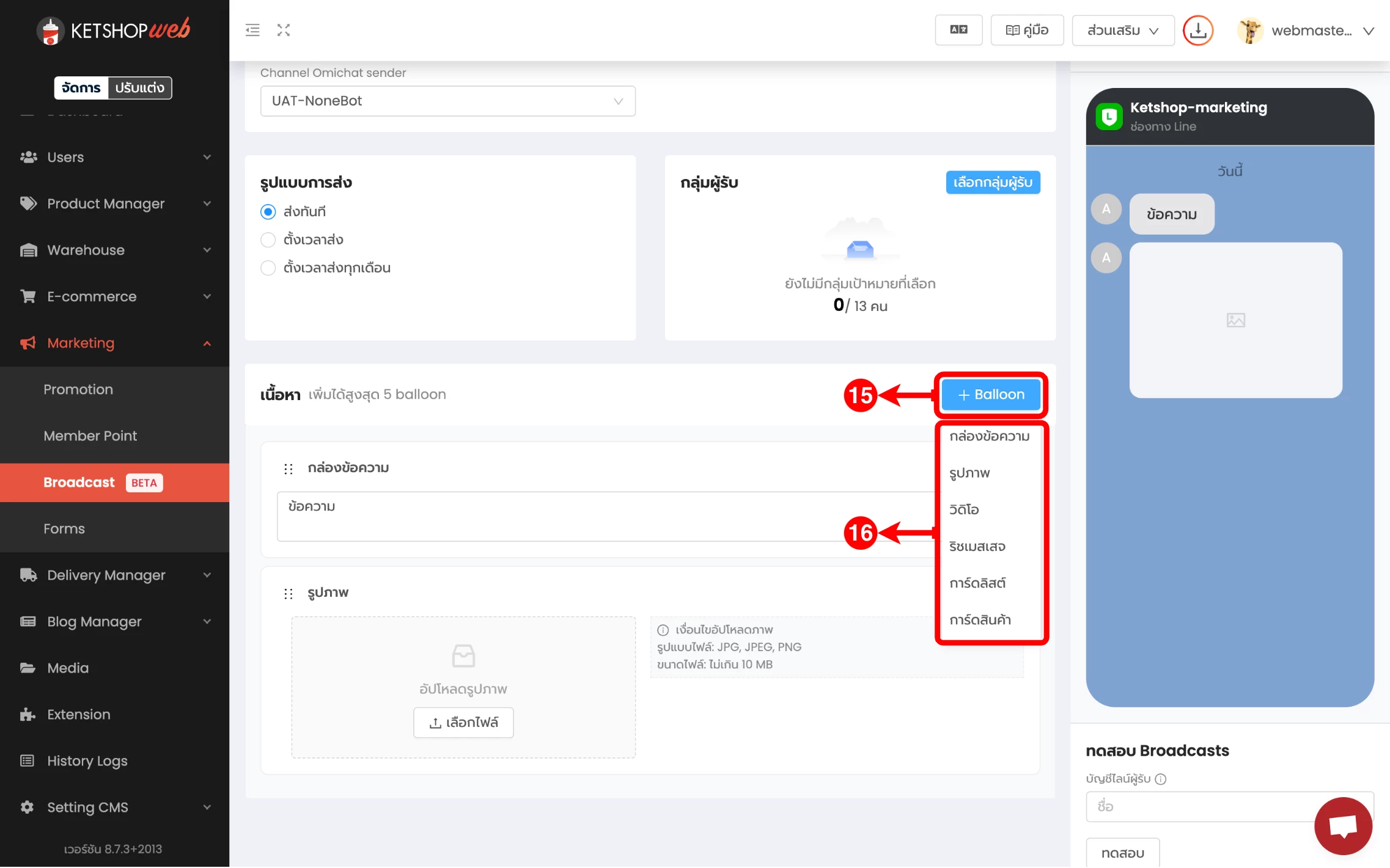 (ตำแหน่งที่ 15) คลิกปุ่ม '+ Balloon' เพื่อเพิ่มรูปแบบข้อความที่ต้องการบรอดแคสต์