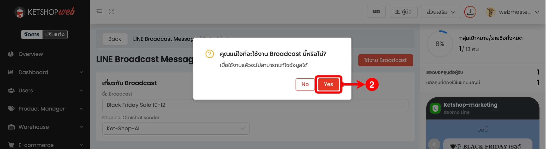 (ตำแหน่งที่ 2) คลิกปุ่ม 'Yes' เพื่อยืนยันการเปิดใช้งาน Broadcast