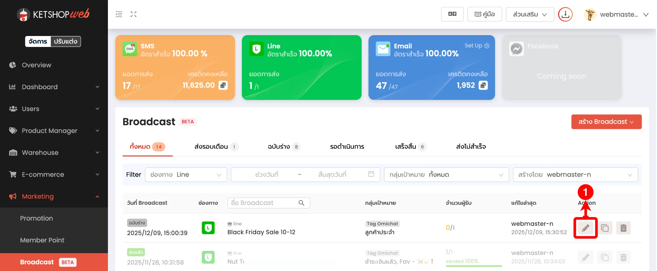 (ตำแหน่งที่ 1) คลิกไอคอนดินสอ เพื่อเข้าหน้ารายละเอียด Broadcast
