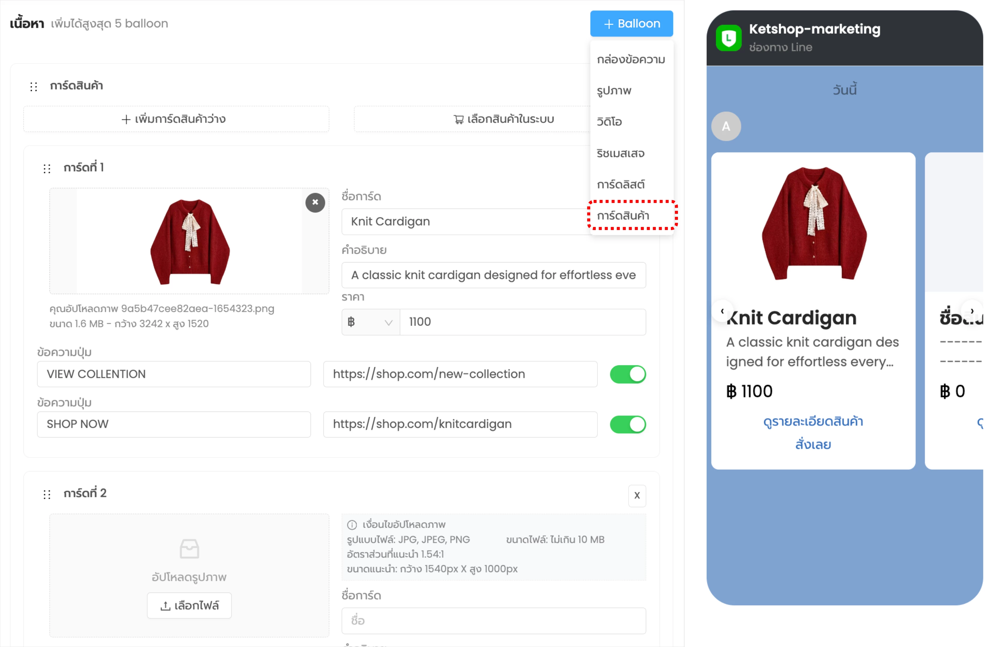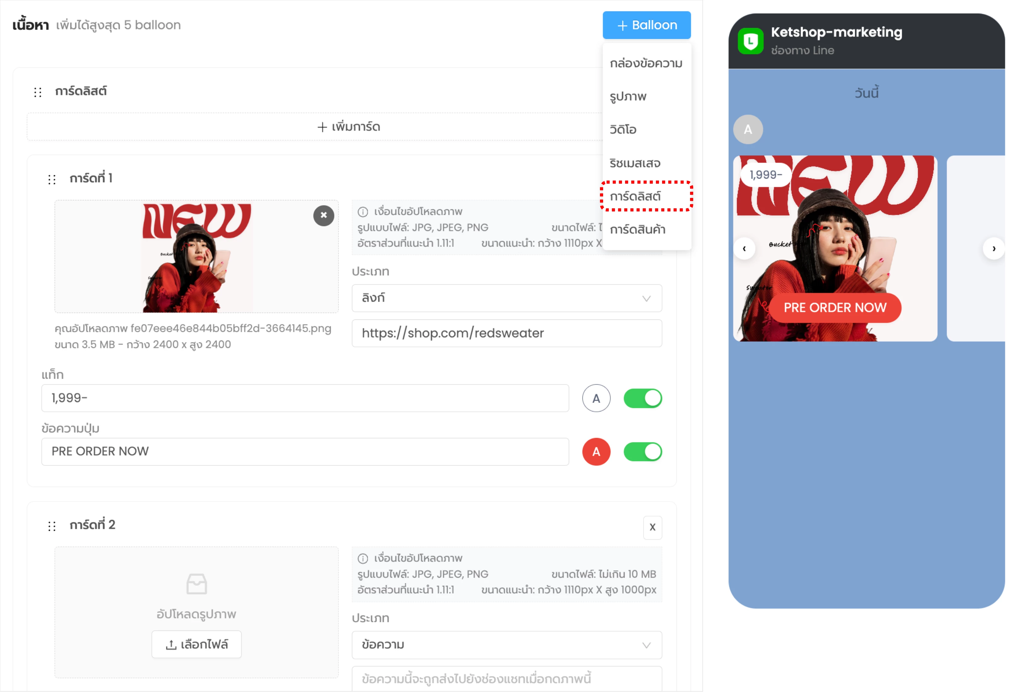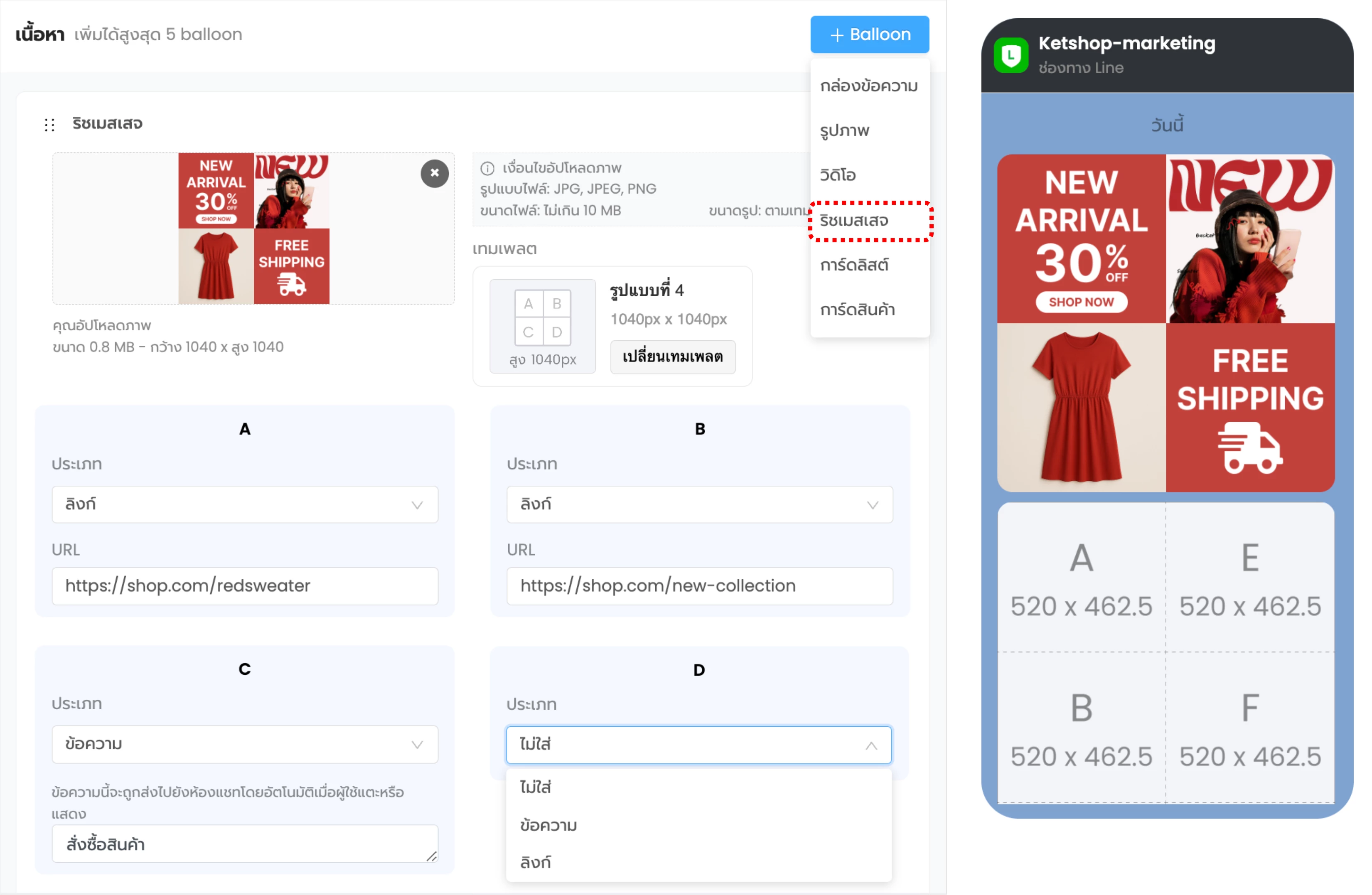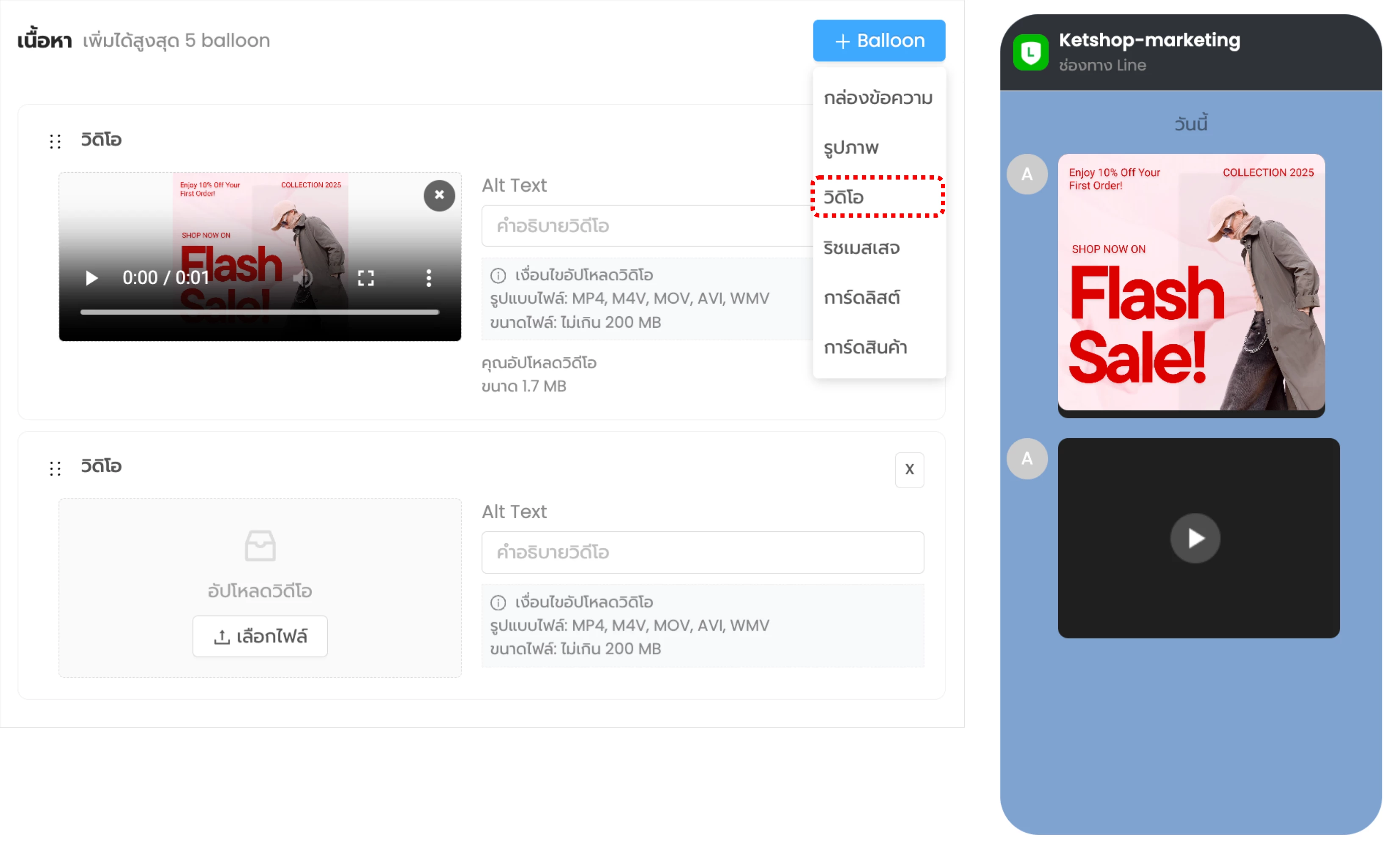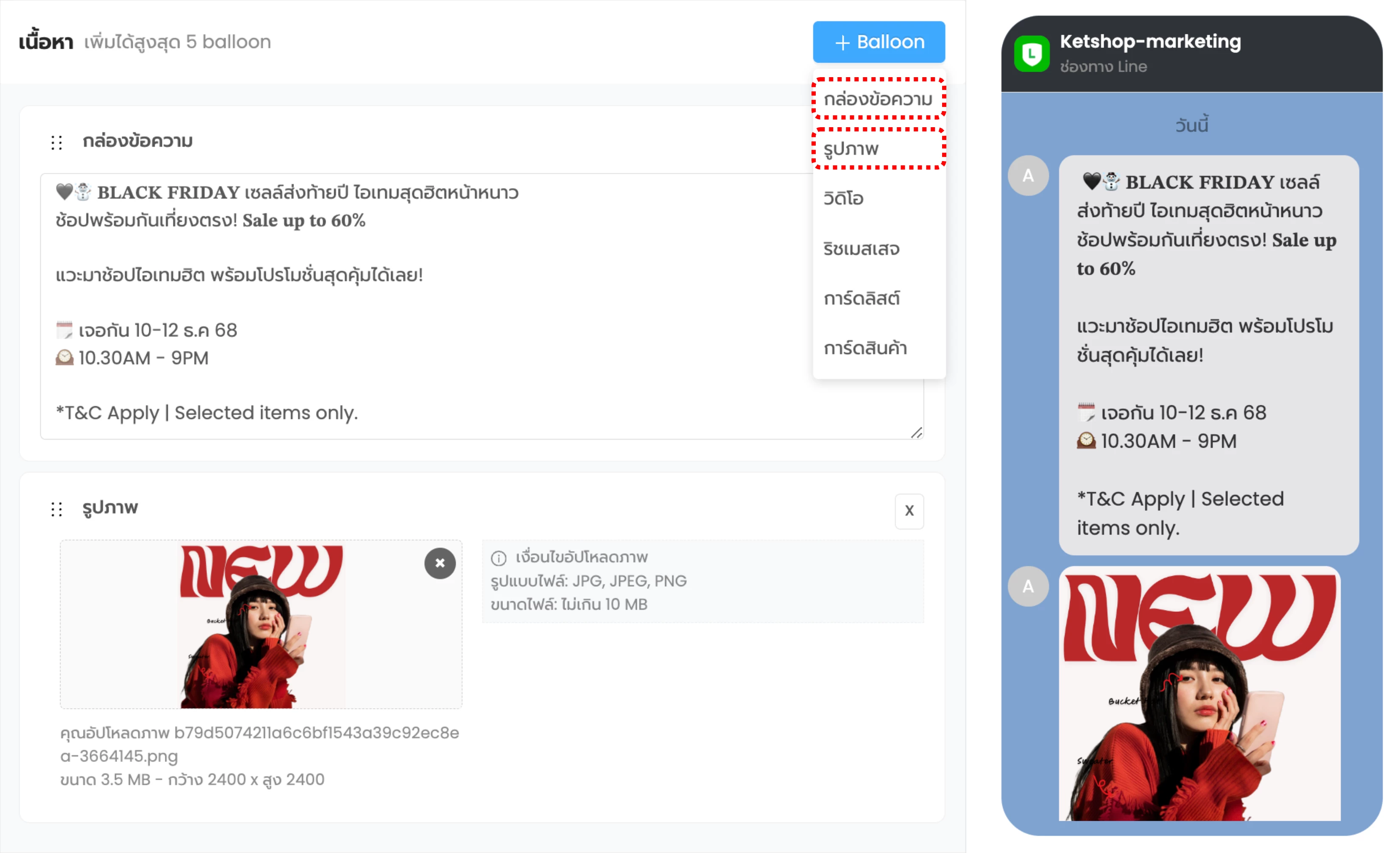 ระบบจะแสดงข้อความเริ่มต้นให้ 2 Balloon คือ รูปแบบกล่องข้อความ และรูปภาพ โดยสามารถลบ และเพิ่มรูปแบบอื่น ๆ ได้ตามต้องการ