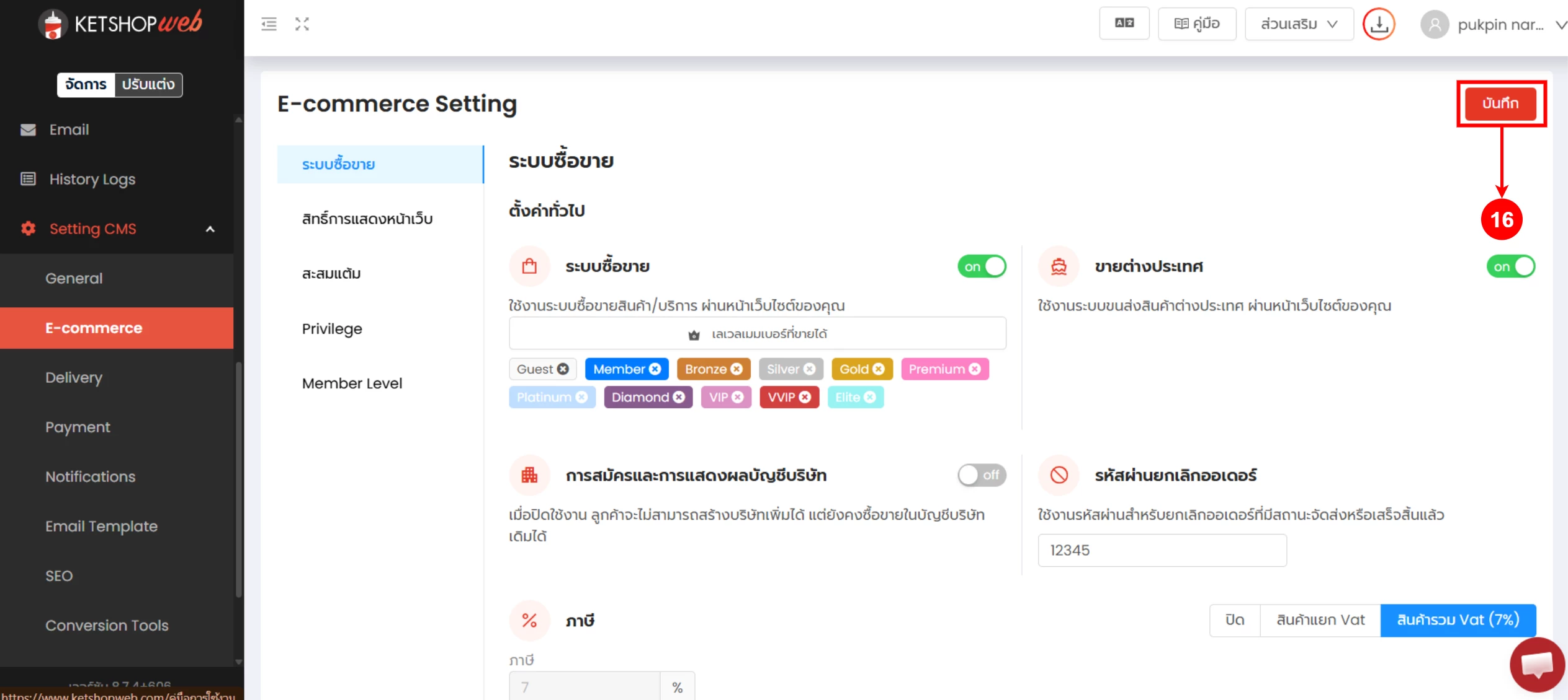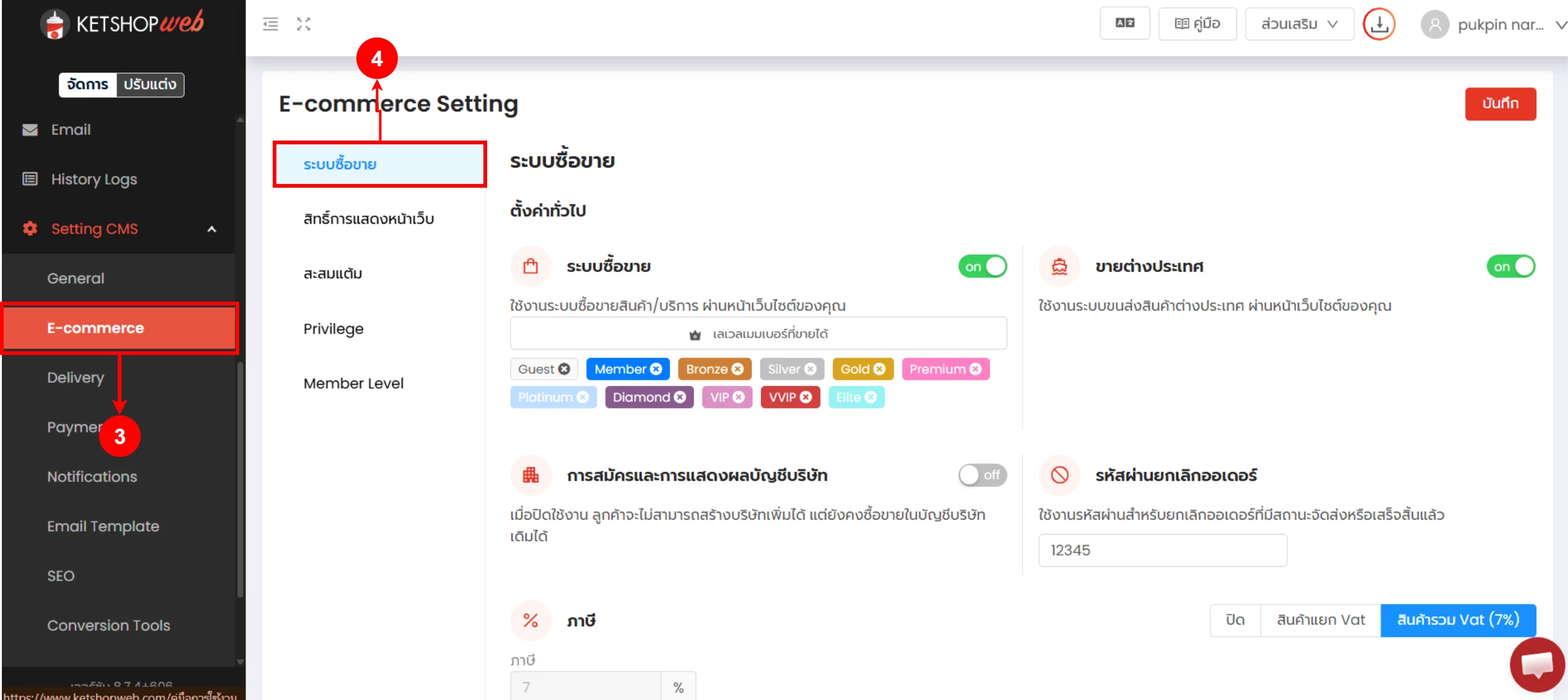 สามารถศึกษาคู่มือการ กำหนดสิทธิ์การซื้อตามระดับสมาชิก ได้ที่คู่มือนี้ > กำหนดสิทธิ์การซื้อตามระดับสมาชิก E-commerce