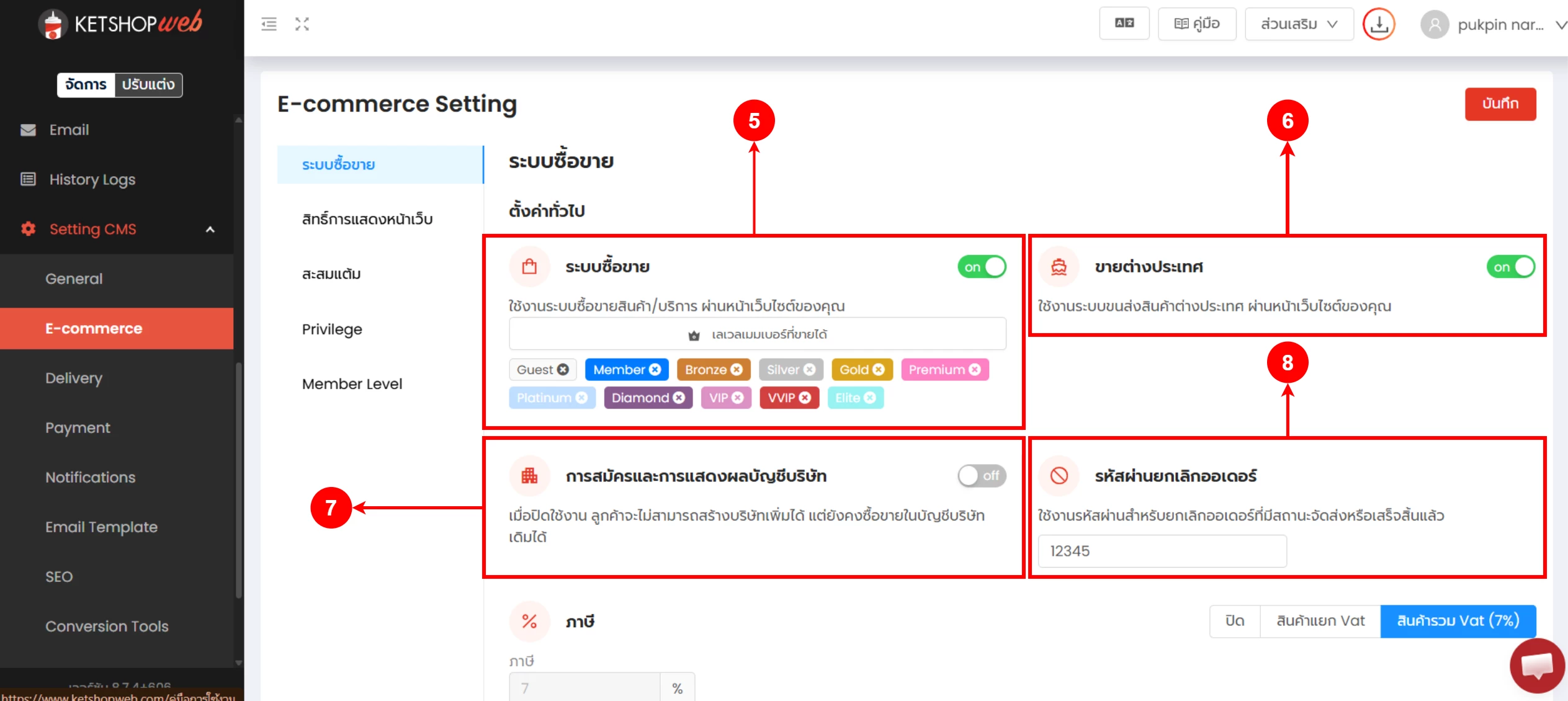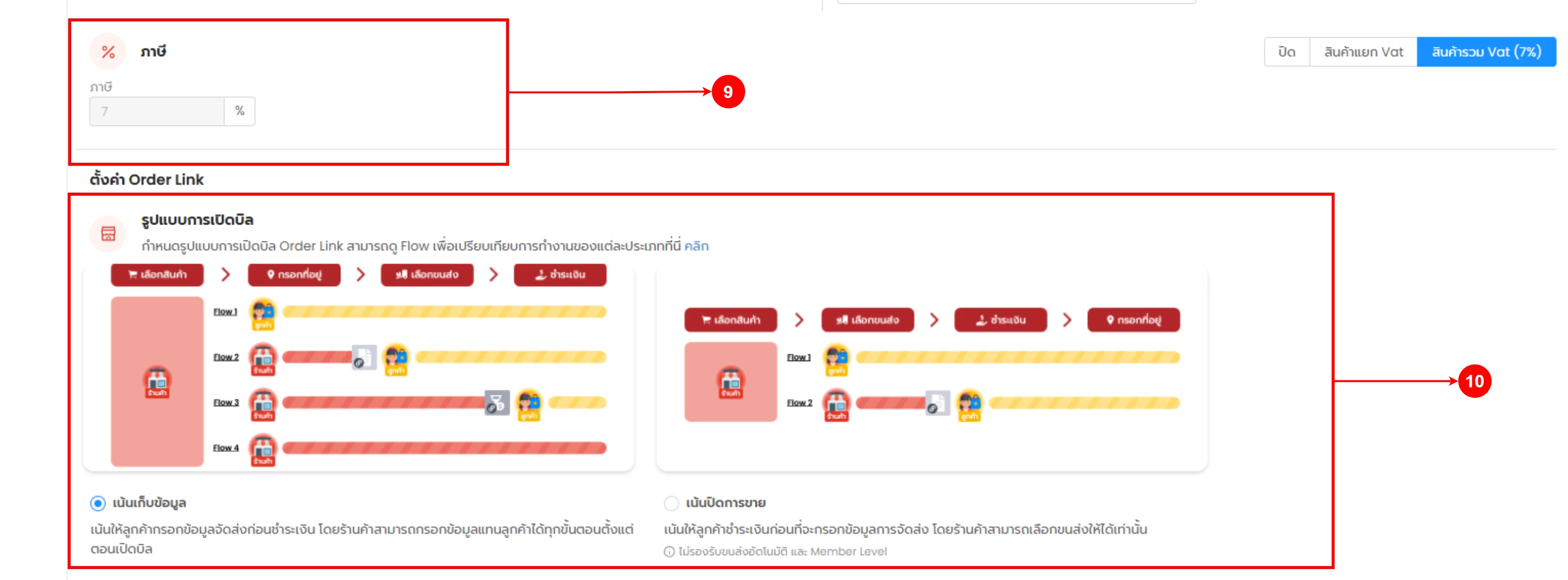(ตำแหน่งที่ 9) การตั้งค่าภาษี สามารถเลือกใช้งานได้ทั้ง ปิดใช้งาน สินค้าแยก Vat และสินค้ารวม Vat