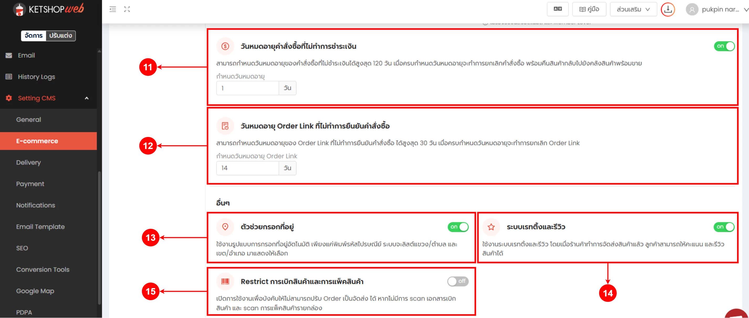 (ตำแหน่งที่ 11) ตั้งค่า วันหมดอายุคำสั่งซื้อที่ไม่ทำการชำระเงิน คลิก "เปิด-ปิดการใช้งาน"