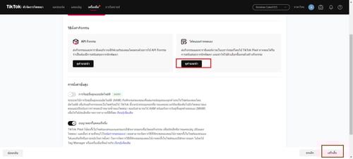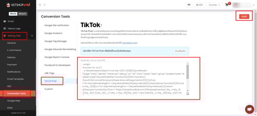 12. กลับไปที่หลังบ้านเว็บไซต์ เมนูจัดการ -> Setting CMS -> Conversion tools -> Tiktok Pixel -> นำโค้ดที่คัดลอก วาง และบันทึก