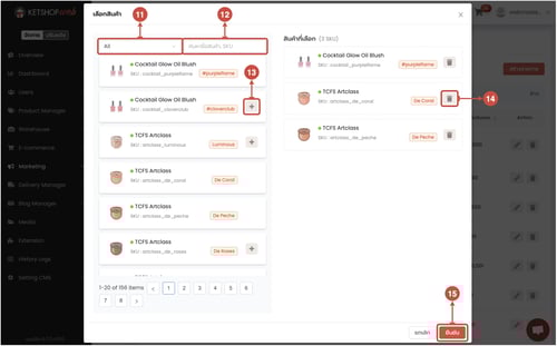 (ตำแหน่งที่ 13) คลิกไอคอน + ที่สินค้าที่ต้องการสร้างเป็นสินค้าแลกฟรี (สินค้าจะมาแสดงอยู่ทางด้านขวามือ)
