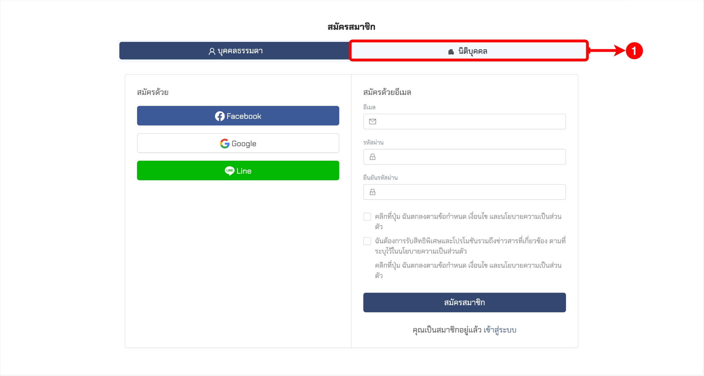 (ตำแหน่งที่ 1) คลิกเลือกแท็บ 'นิติบุคคล'