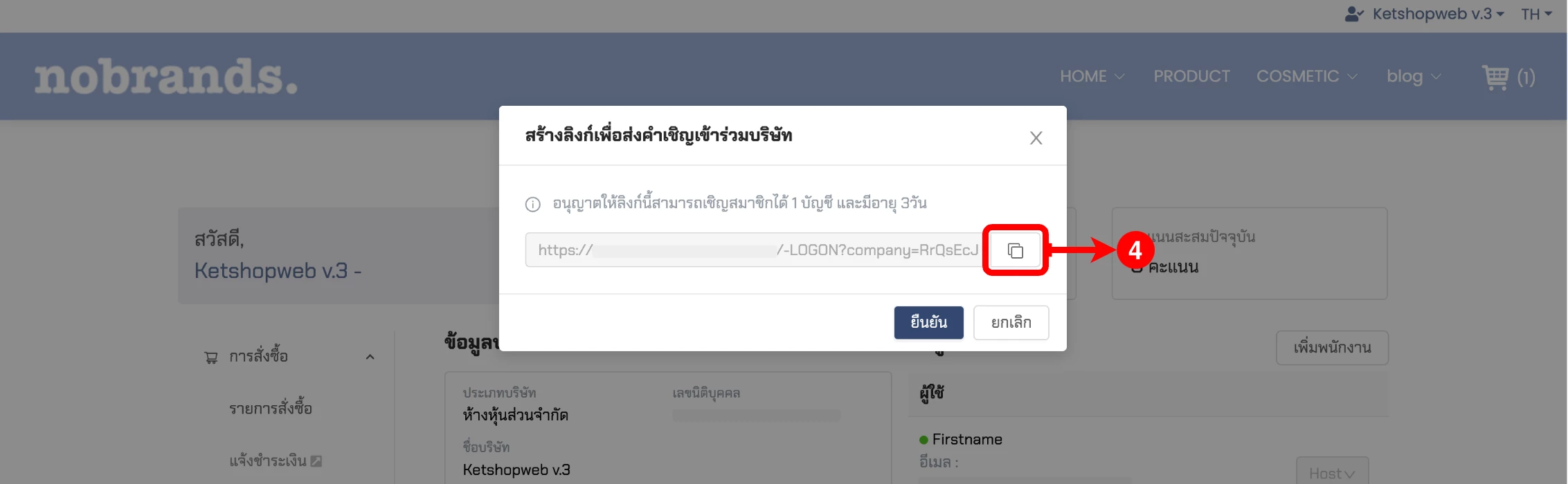 (ตำแหน่งที่ 4) คลิกคัดลอกลิงก์คำเชิญเข้าร่วมบริษัท แล้วส่งให้สมาชิกที่ต้องการเพิ่มเข้าบริษัท