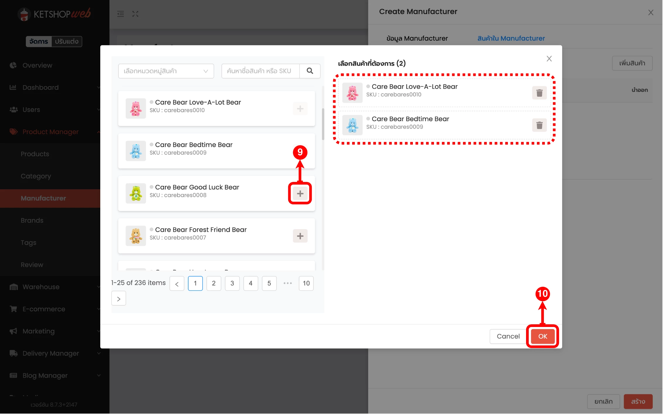 (ตำแหน่งที่ 9) คลิกที่ไอคอน + ที่สินค้าที่ต้องการเพิ่มเข้าผู้ผลิต (สินค้าที่เลือกจะแสดงอยู่ทางด้านขวามือ)