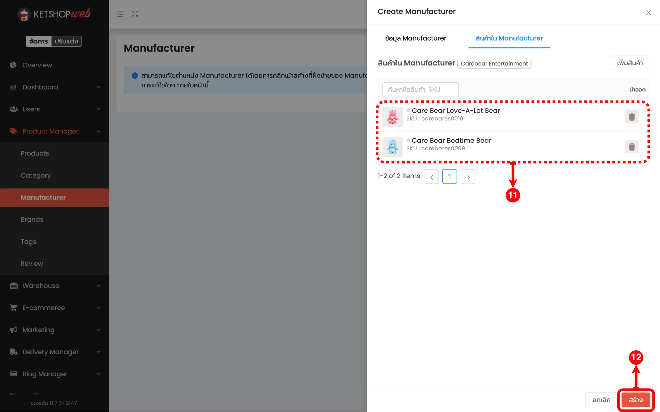 (ตำแหน่งที่ 12) เมื่อเพิ่มสินค้าเรียบร้อยแล้ว คลิกปุ่ม 'บันทึก'