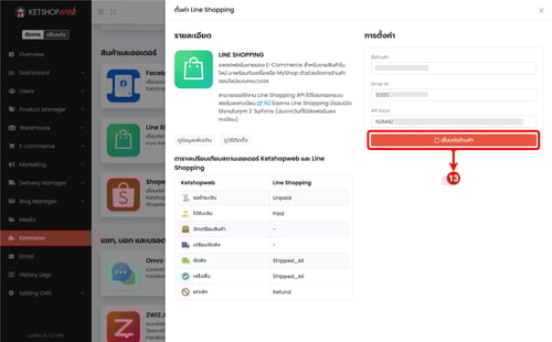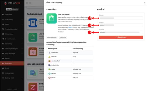 แต่ก่อนที่จะเชื่อมนั้น ทางร้านค้าจะต้องทำการแจ้ง Line Shopping เพื่อขอเปิด Extension API กับทาง Line เสียก่อน ซึ่งทาง Line Shopping จะมีเกณฑ์ที่ทางร้านต้องผ่านก่อนถึงจะสามารถขอเปิดส่วนนี้ได้ เมื่อทาง Line เปิดให้เเล้ว จึงจะสามารถสร้าง API Keys เพื่อที่จะนำเอามาใส่ใน Ketshopweb สำหรับการเชื่อมต่อกับ Ketshopweb ได้