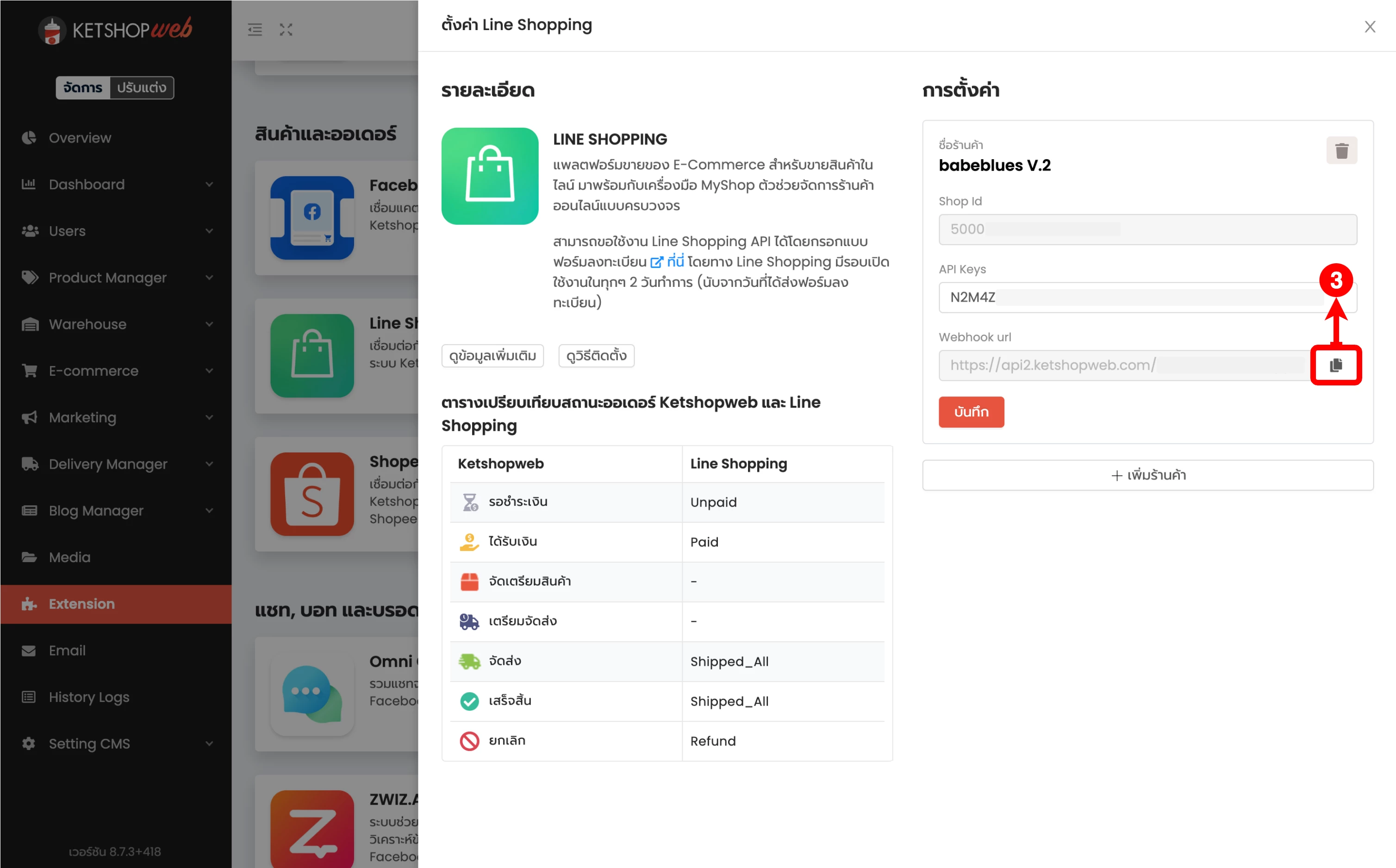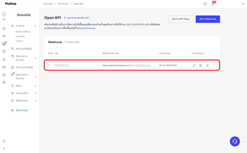 (ตำแหน่งที่ 3) คลิกคัดลอก Webhook url ของร้านค้า Line Shopping
