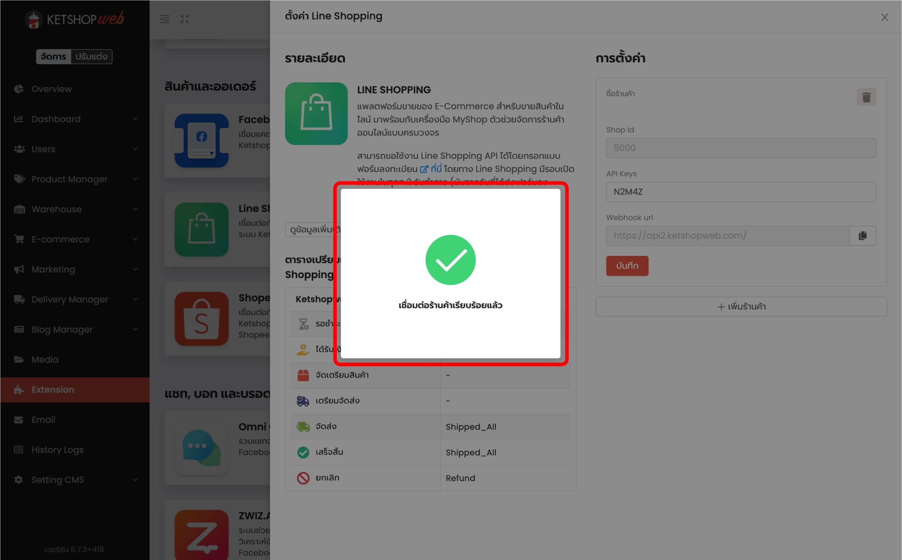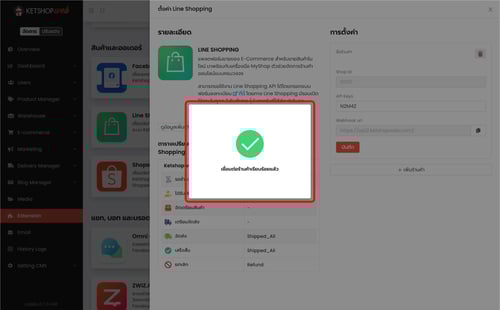 ระบบ Ketshopweb รองรับการเชื่อมต่อร้านค้ากับ Line Shopping ได้ และรองรับการเชื่อมหลายร้านค้าพร้อมกันได้อีกด้วย ซึ่งการเชื่อมต่อกับ Line Shopping จะเป็นการ sync จำนวนสินค้าพร้อมขายในแต่ละร้านค้า และรวมไปถึงการรับรายการสั่งซื้อเข้ามาใน Ketshopweb เพื่อให้ผู้ใ้ช้งานสามารถปรับสถานะคำสั่งซื้อจากที่เดียวได้ รวมไปถึงการใช้ขนส่งผ่าน ketshopweb ที่สามารถส่งข้อมูลขนส่ง รวมไปถึงข้อมูล Tracking Code กลับไปยัง Line Shopping เพื่อแจ้งสถานะขนส่งผ่าน Line ได้ทันที