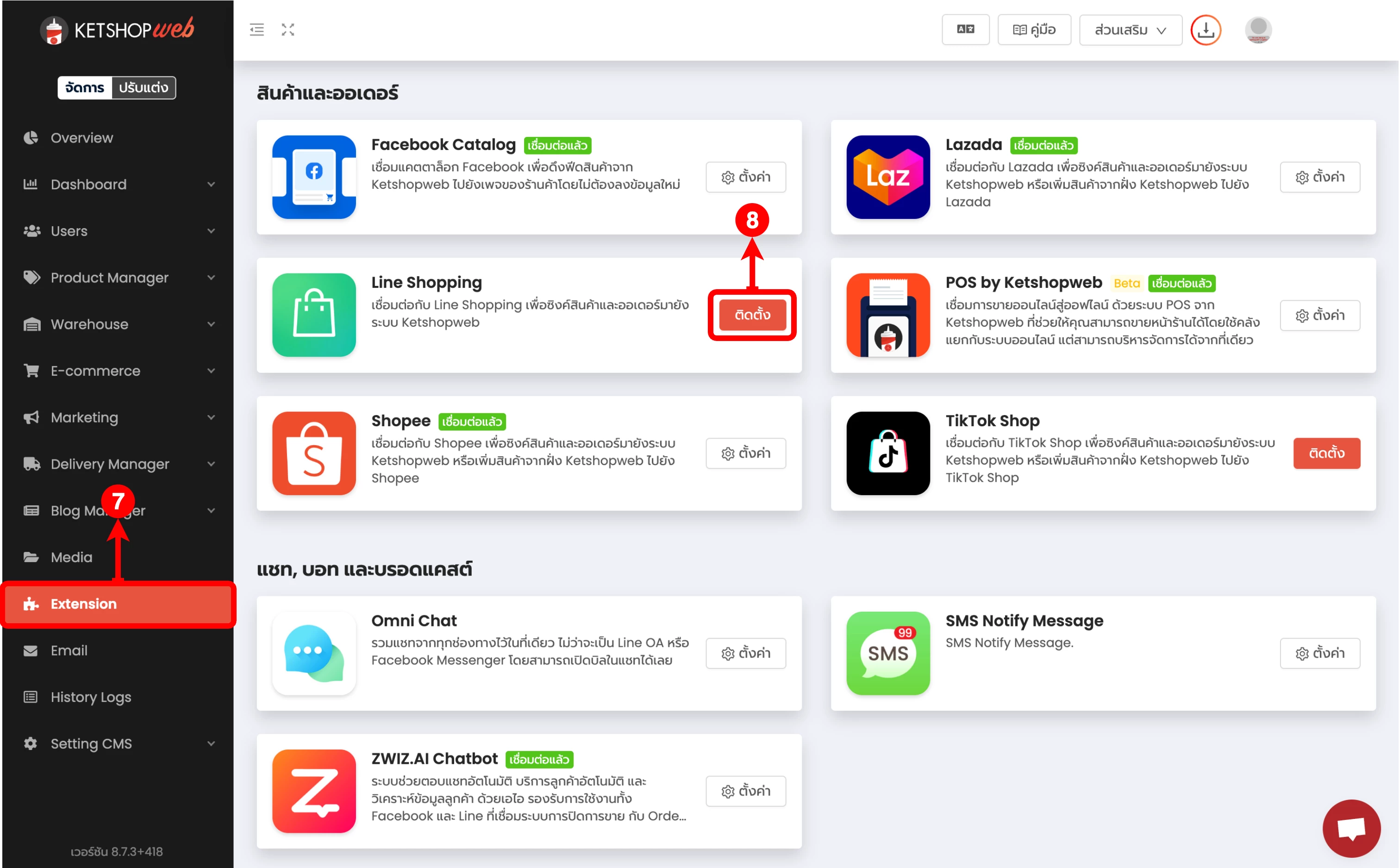 (ตำแหน่งที่ 8) ในส่วนสินค้าและออเดอร์ ให้คลิกที่ปุ่ม 'ติดตั้ง' ที่ Line Shopping