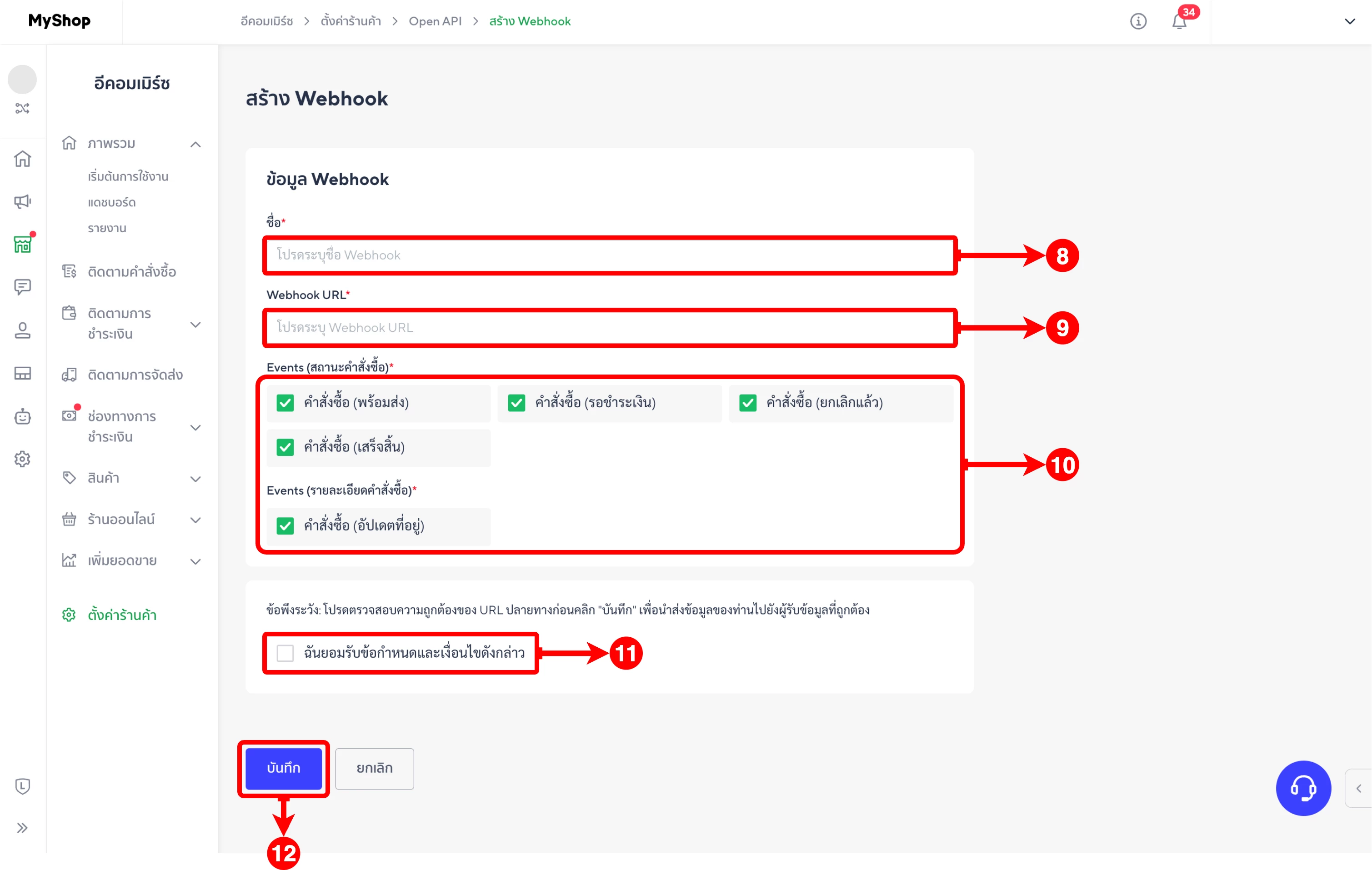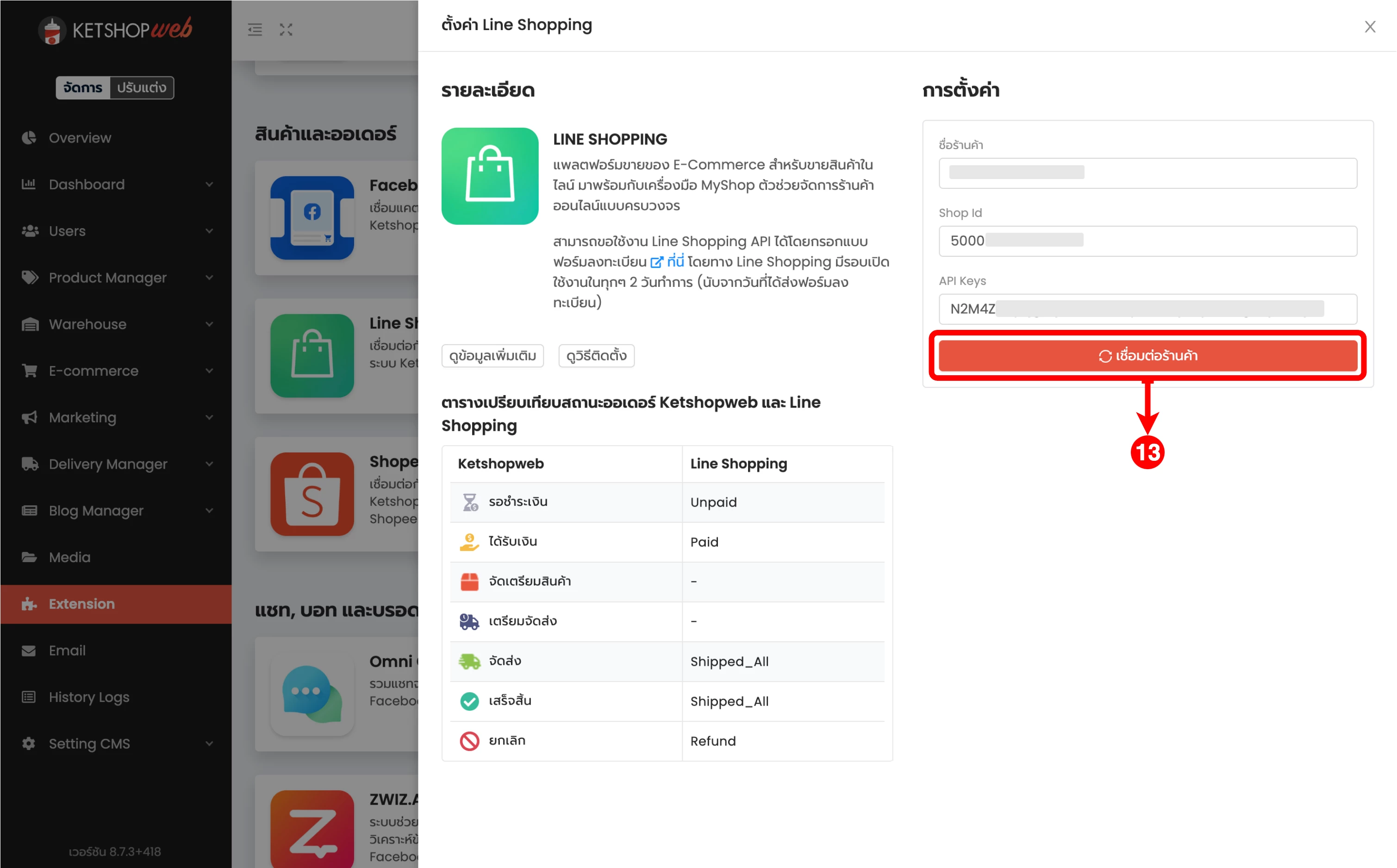 (ตำแหน่งที่ 13) เมื่อกรอกข้อมูลครบถ้วนแล้ว ให้คลิกที่ปุ่ม 'เชื่อมต่อร้านค้า'