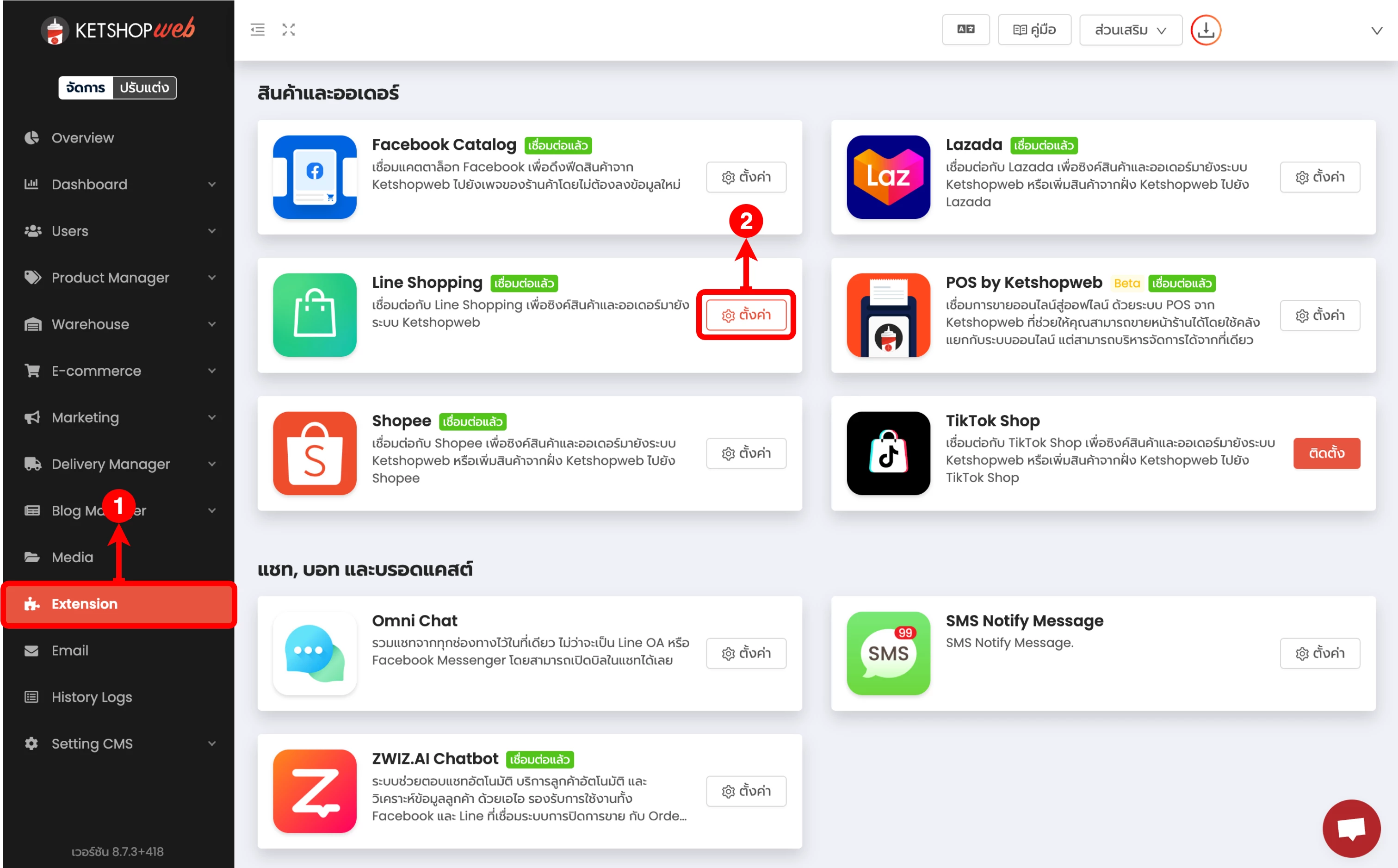 (ตำแหน่งที่ 2) ในส่วนสินค้าและออเดอร์ ให้คลิกที่ปุ่ม 'ตั้งค่า' ที่ Line Shopping
